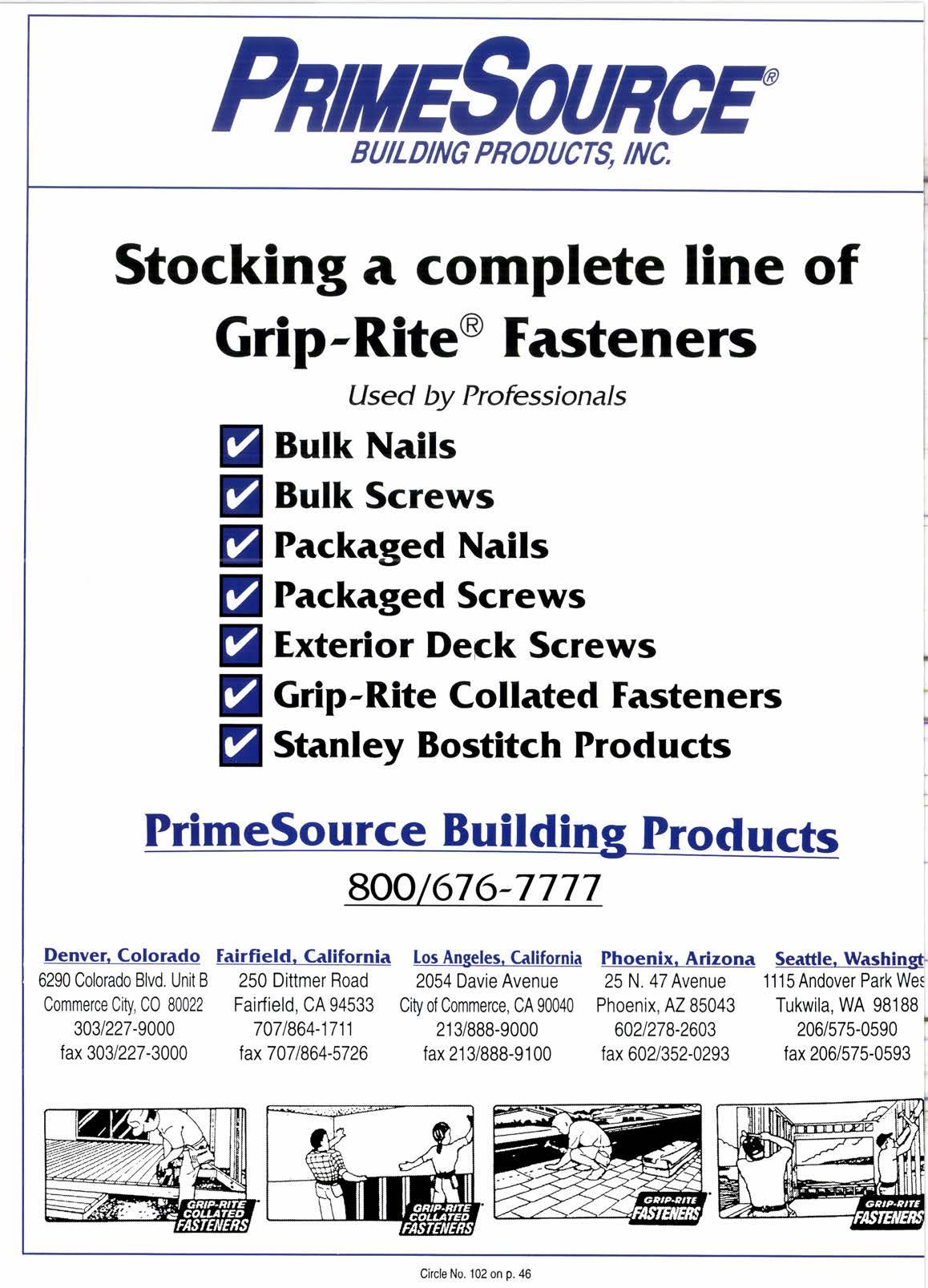 BUILDING PBODUCTS, INC, Stocking a complete line of Grip-Rite@ Fasteners Used by Professionals Bulk Nails Bulk Screws Packagecl Nails Packagecl Screws Exterior Deck Screws Grip-Rite Collatecl Fasteners Stanley Bostitch Proclucts PrimeSource Builclin Proclucts Seattle. Washingtl 1115 Andover Park Wes Tukwila, WA 98188 206/575-0590 fax 206/575-0593 ul ul ul ul ul ul ut 8OO -/''-7777 Denver. Colorado 6290 Colorado Blvd. Unit B Commerce City, C0 80022 303/227-9000 fax 303/227-3000 fairfield. C-alifornia 250 Dittmer Road Fairfield. CA 94533 707t864-1711 tax7071864-5726 los Angeles. Callfornia 2054 Davie Avenue City of Commerce, CA 90040 21 3/888-9000 fax 213/888-9100 Phoenix. Arlzona 25 N. 4TAvenue Phoenix, AZ 85043 6021278-2603 fax 602352-0293 Circle No. 102 on p. 46