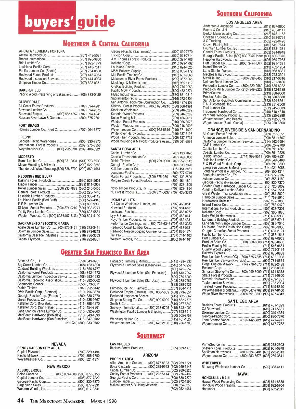 BILLIT{GS Georgia-Pacitic Cop ......(800) $erc70 COLORADO DENVER All-Coast Foresl Products....(800) 332-8977 (303) 761 -9882 Capital Lumberco. ........(303) 3214003 Georgia-Pacific Corp ......(800) 8307370 Primesource............ ......(303) 227-9000 Tdmco Millwofi...... ........(303) 371-8888 Weyertraeuser Co...(ln Co.) (8Cn) $2-8291 (303) 433-8571 GRAI{D JUNCTION Trimco Millwork...... ........(970) 434-0800 UTAH SALT LAKE C]TV Capital LumberCo.. .......(801) 484-2007 Clearfield Conveyors...........(800) 453-2446 (801) r/&1311 Diablo Timbor.......... ..(801) 76$8519 Dimensions. Inc. 648-s065 Forest Products Sales .........(8Cr0) 666-2467 (801) 262-e128 Geo4ia-PacilicCorp ......(800) 83G7370 MacBeath Hardwood ......(801) 48+7616 Trimco Millwork...... ........(801)467-0077 Ulah Wood Preserving.........(800) 666-2467 (801 ) 295-9449 Weyefia€user Co................(800) 283-9663 (801) 972-5525 IDAHO BOISE Boise Cascade Corp .......(800) 228-0815 Georgia-Pacific Corp ......(800) 83S7370 Q.B. Corp. .....................(208) 75&4248 Tdmco Millwort (Boise)..................................(208) 33&9000 Tdmco Millwork (ldaho Falls) .........................(208) 528-3069 Wey€rhaeusefco.. ........(800) 221-3064 COEUR D'ALENE ldaho Csdar Sales (Troy)...............................(208) 835-2161 Millriver Architeclural Hardmods...................(208) 762-9663 Weyefiaeuser C,0.................(800) 221-3064 (208) 362-5261 Whitenun Lumber Co. ...................................(208) 682.4602