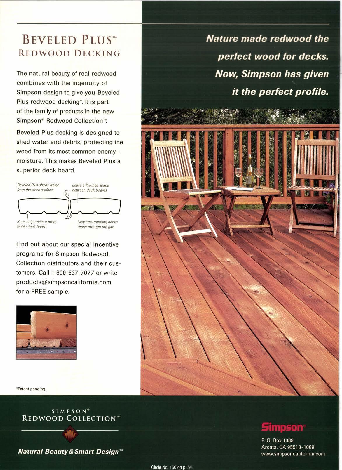 The natural beauty of real redwood combines with the ingenuity of Simpson design to give you Beveled Plus redwood decking*. lt is part of the family of products in the new Simpson' Redwood Collectioni Beveled Plus decking is designed to shed water and debris, protecting the wood from its most common enemymoisture. This makes Beveled Plus a superior deck board.