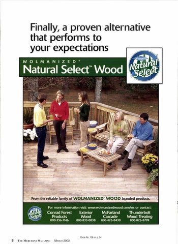 Seruing building products retailers and wholesale distributors in MARCH 2OO2 l3 Western states-Since 1922 VOLUME 80. NO.9 7 freoters fo phose out CGA treqted wood over nerf, two yeors Wood oreservers to convert to 0rsenote-free ohernotives for non-indu$riol wood oroducts. 9 Deolers'tips to sell redwood Yords use deck clinics, Web sites, home show direct moil, ond other soles tools. l0 Morketing wesiern