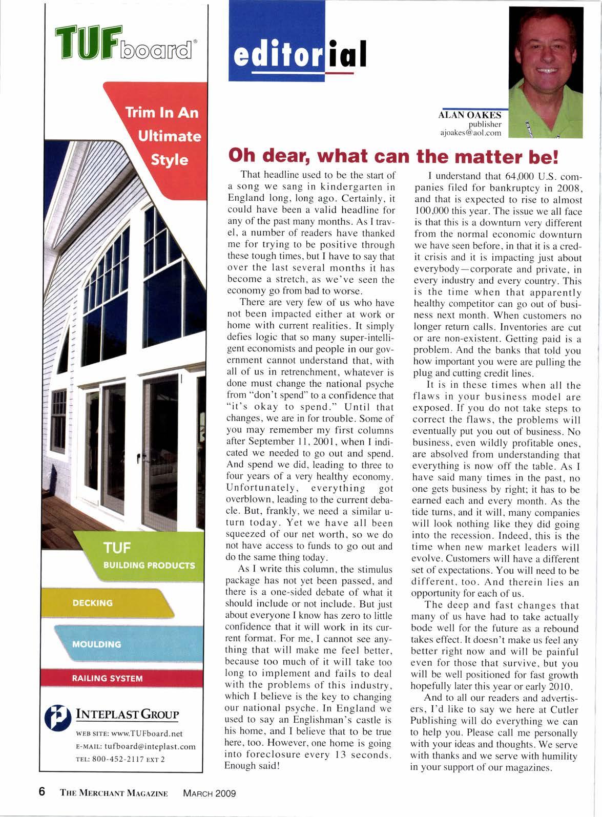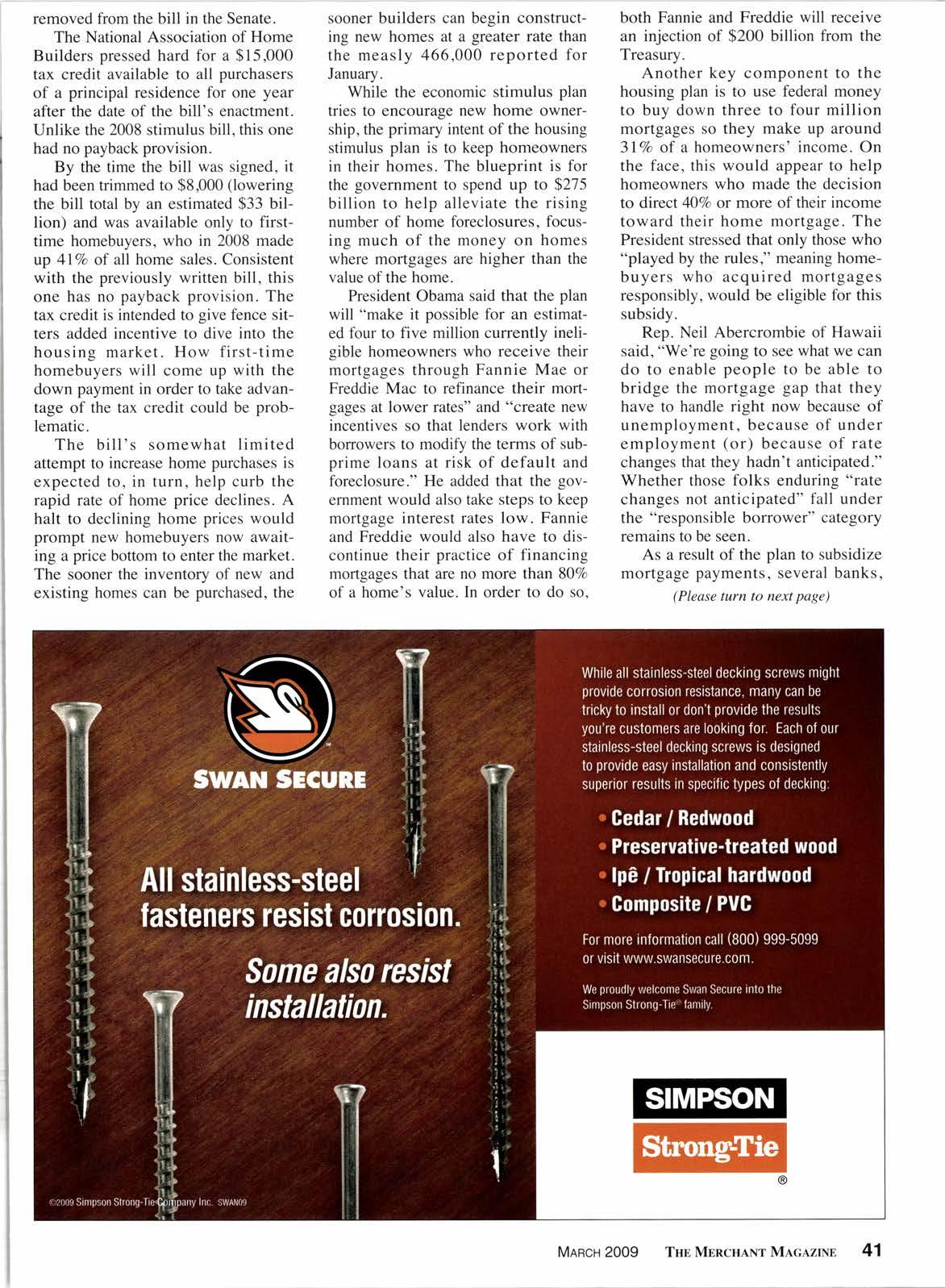 As I write this column, the stimulus package has not yet been passed, and there is a one-sided debate of what it should include or not include. But iust about everyone I know has zero to little confidence that it will work in its current format. For me, I cannot see anything that will make me feel better, because too much of it will take too long to implement and fails to deal with the problems of this industry, which I believe is the key to changing our national psyche. In England we used to say an Englishman's castle is his home, and I believe that to be true here, too. However, one home is going into foreclosure every 13 seconds.