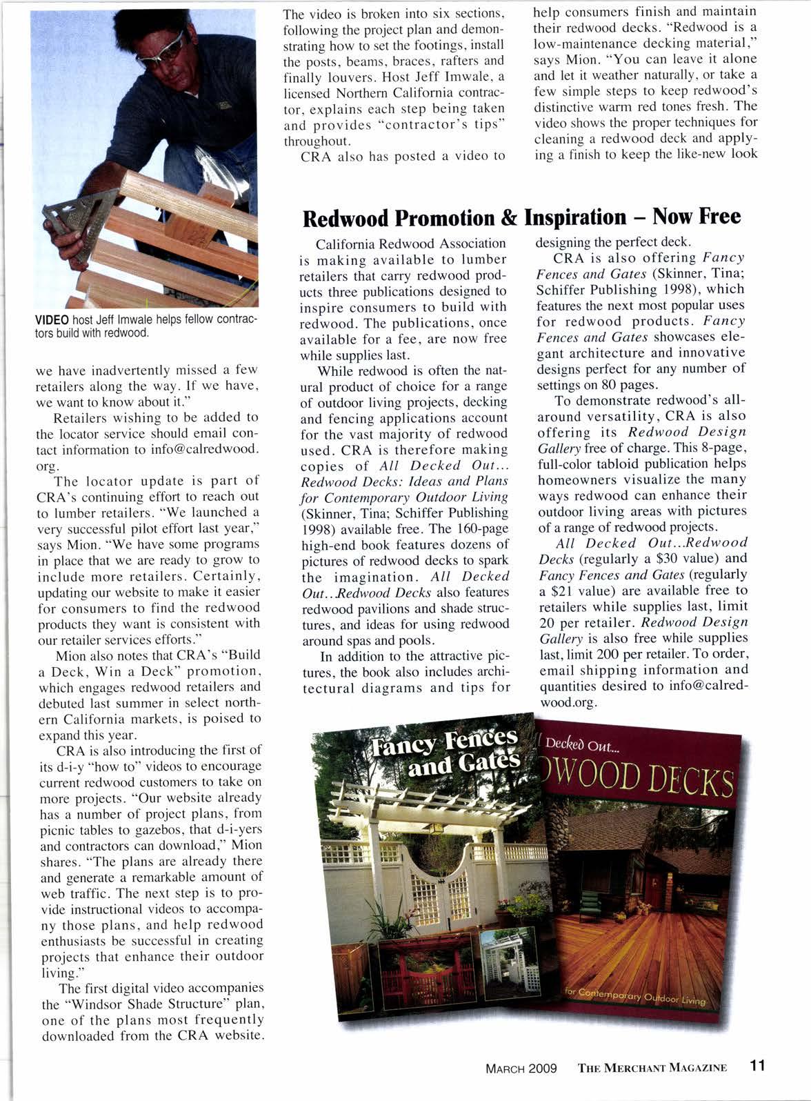 All Decked Out...Redwood Decks (regularly a $30 value) and Fancy Fences and Gates (regularlY a $21 value) are available free to retailers while supplies last, limit 20 per retailer. Redwood Design Gallery is also free while suPPlies last, limit 200 per retailer. To order, email shipping information and quantities desired to info@calredwood.org.