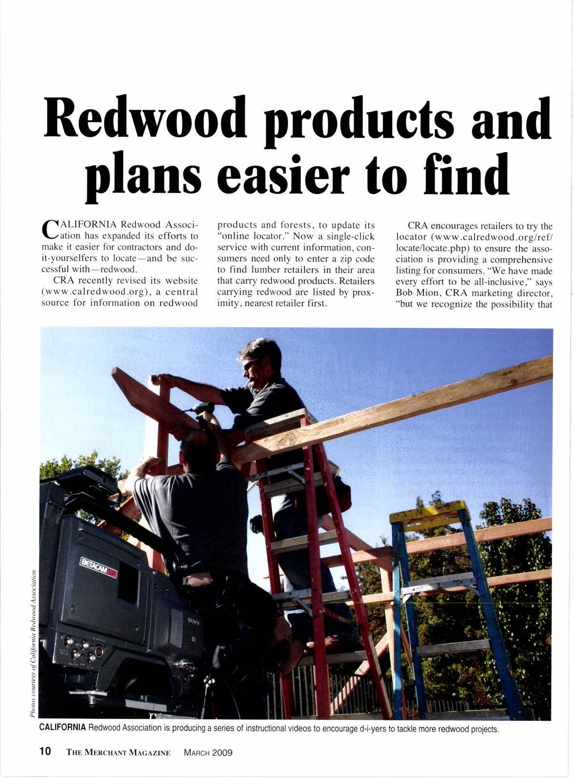 The locator update is Part of CRA's continuing effort to reach out to lumber retailers. "We launched a very successful pilot effort last year," says Mion. "We have some Programs in place that we are readY to grow to include more retailers. Certainly, updating our website to make it easier for consumers to find the redwood products they want is consistent with our retailer services efforts."