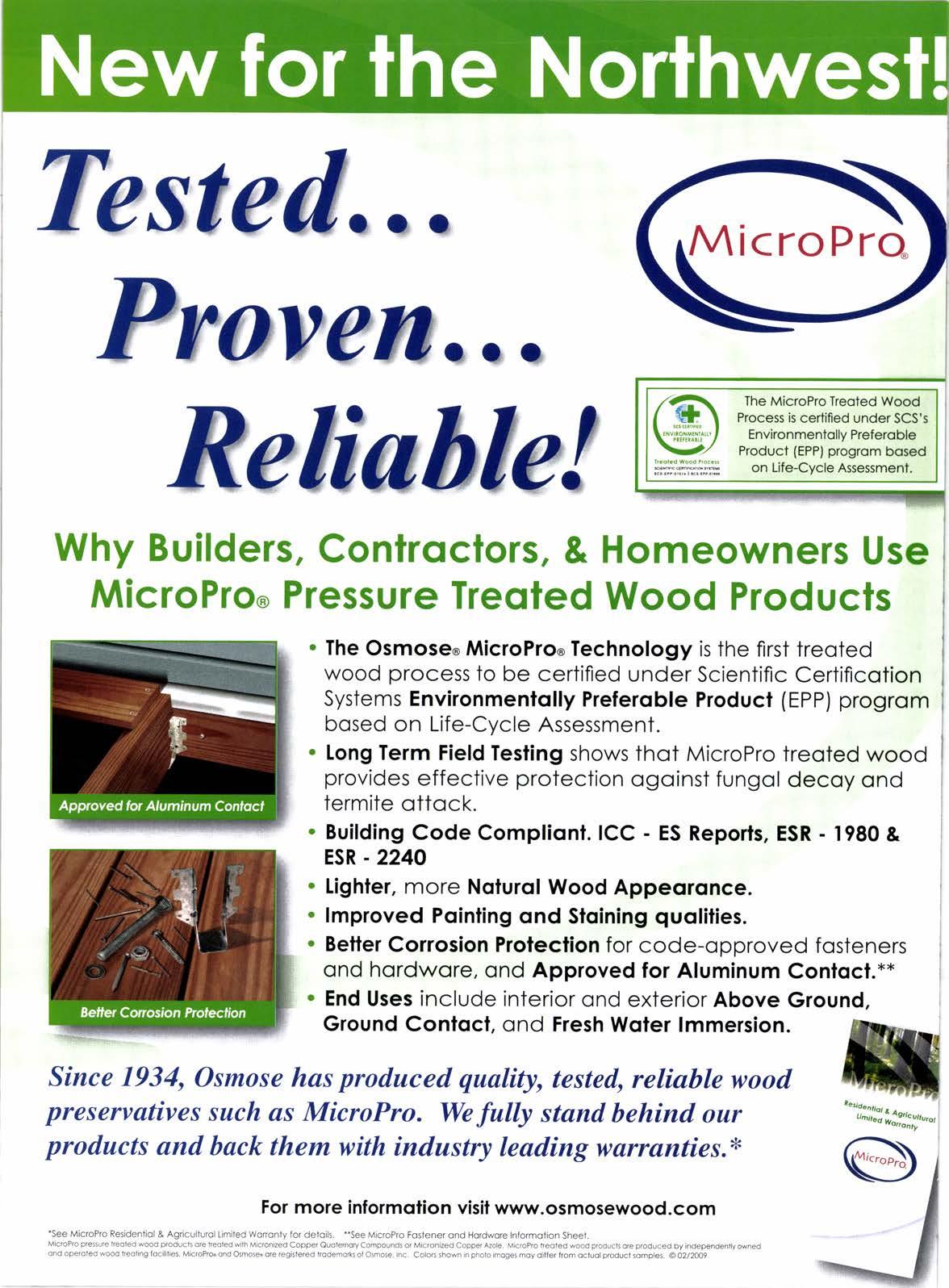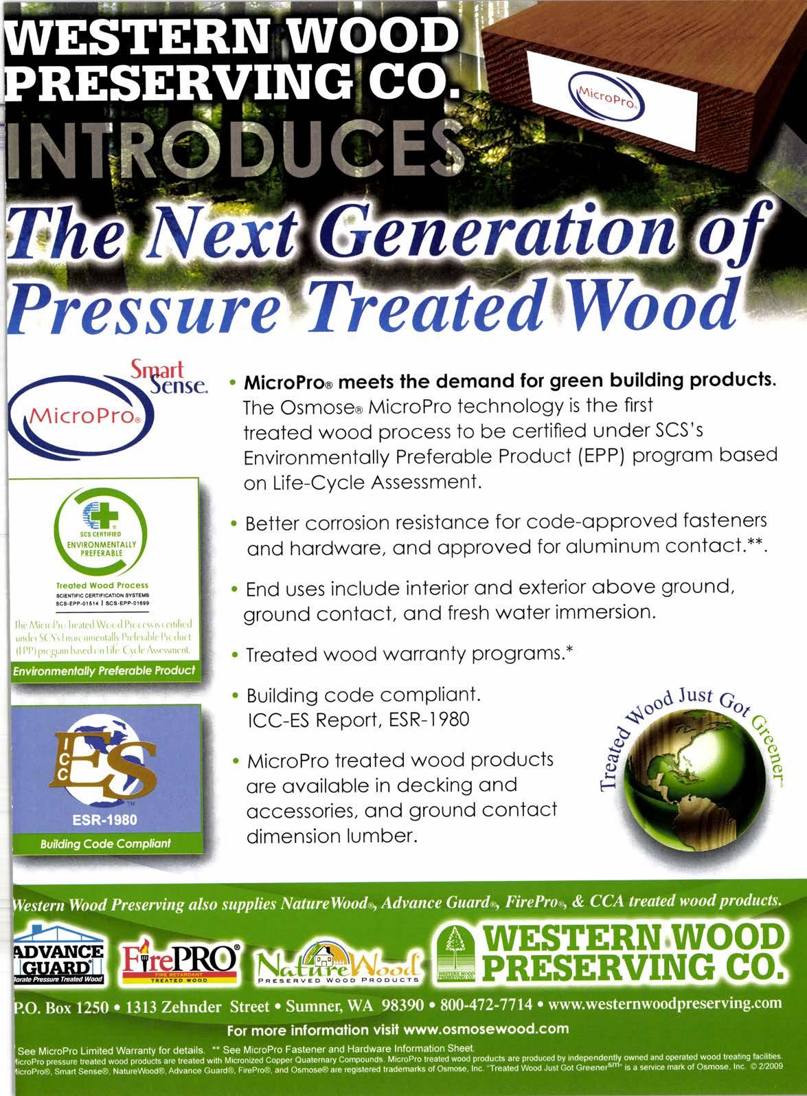 Western Wood Preserving Co., Sumner, Wa., has begun using Osmose's MicroPro technology, which reduces the copper content to solid, "sub-micron" sized particles. The process creates a treatment that is corrosion-resistant for code-approved fasteners and hardware, enabling MicroPro treated wood to be used in direct contact with aluminum.