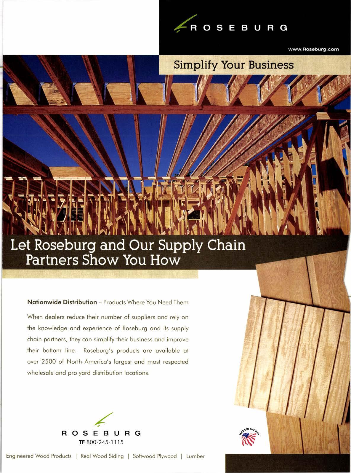 When deolers reduce their rrunrber of suppliers orrd rely on the knowledge ond experience of Roseburg ond its slrpply choin pcrlners, they con sirrplify iheir busirress or-rd inrprove their bottonr line. Roseburg's procJucts crre ovoiloble oi over 2500 of Norlh Anrcrico's iurgesl ond rrrost respec.ted wholesole nnd pro yord distr"ibution locoiions. ROSEBURG