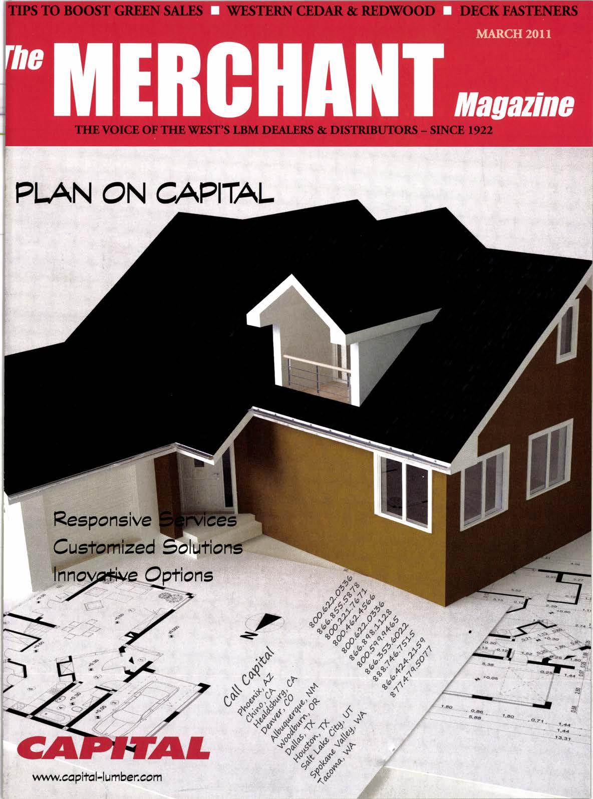 ON Snlrs 32 Fnr'arLv Busrnrss 35 Assocrlror Uponrr 36 Movrns & Snnxrns 38 Nrw Pnooucrs 46 lr.r Mrmonrnu 4B Cr-nssrrrro Mnnrrrpucr 49 Dnrr Boor 50 lorn Frr-r 50 Aovrnrsrns lNorx Online Bnrlxrrc lrousrnv Nrws, Ittousrny PHoro DowNlonos, & Tnr MrncnnHr: Drcrrnl VrnsroN B urror Nc-PnoDUCTS.coM Tur MrncHnNT oN Fncrsoox Sr,cRcH "THr MtncHRNT MAGAZTNE" oN FRcggoox.coN.l CHANGE 0F ADDRESS Send address label from recent issue if possible, new address and g-digit zip to address below. POSTMASTER Send address chanoes to The Merchant Magazine. 4500 Campus Dr., Ste. 480-, Newport Beach. Ca. 92660.1872. The Merchant Magazine (ISSN 7399723) (USPS 796"560) is published monthly at 4500 Campus Dr., Ste. 480, Newport Beach, Ca. 92660-i872 by Cutler Publishing, Inc. Periodicals Postage paid at Newport Beach, Ca., and additional post offices. It is an independently{wned publication for the retail, wholesale and distribution levels of the lumber and building products markets in 13 western states. Copyright@2011 by Cutler Publishing, Inc. Cover and entire contents are fully protected and must not be reproduced in any manner without written permission. All Rights Reserved. lt reserves the right to accept or relect any editonal or advertising matter, and assumes no liability for matenals fumished to it. E^ California Timberlineo Inc. TI Sugor ond Ponderoso Pine, Douglos Fir, Redwood, .0 Western Red ond Colifornio Incense Cedor ,*,*rrf,"?,?,sibteForestry Hordwood Lumber & Plywood Chino, cA 91 71 0 . (909) 591-481 I . FAX (909) s9r -48r 8 scs-coc-001973 @1996 Forest Stewardship Council A.C 4 r The ilerdrant llagazine r Mardt mtl BuiHing-Productscun
