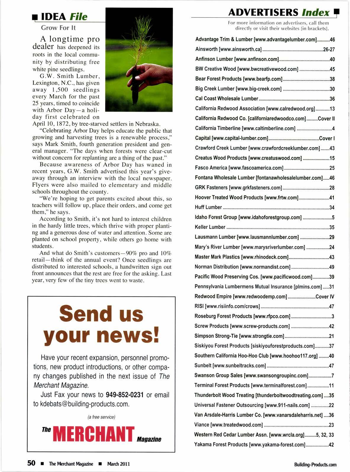 For more information on advertisers, call them directly or visit their websites [in brackets]. Advantage Trim & Lumber [wvrw.advantagelumber.com]..........46 Ainsworth [www.ainsworth.ca].....,........... .....26-27 Anfinson Lumber [www.anfinson.com]... ...........40 BW Greative Wood [www.bwcreativewood.com] ........................45 Bear Forest Products [www.bearfp.com].....................................38 Big Creek Lumber [www.big.creek.com] .....,.,.,........,.,......,........,30 California Redwood Association [www.calredwood.org]...........1 3 California Redwood Co. [californiaredwoodco,com],........Gover ll California Timberline [www.caltimberline.com] ...............,.,........,.4 Capital [www.capita1.1umber.com]....................................,..,Cover I Crawford Creek Lumber [www.crawfordcreeklumber,com].......43 Creatus