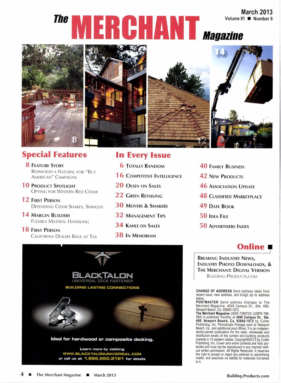 The Merchant Magazine (ISSN 7399723) (USPS 796560) is published monthly at 4500 Campus Dr., Ste. 480, Newport Beach, Ca. 92660-1872 by Cutler Publishing, Inc. Periodicals Postage paid at Newport Beach, Ca., and additional post offices. lt is an indeoendently-owned publication for the retail, wholesale and distribution levels of the lumber and building products markets in 13 western states. Copyright@2013 by Cutler Publishing, Inc. Cover and entire iontents are fully protected and must nol be reproduced in anv manner wilhout written permission. Al[ Rights Reserv-ed. lt reserves the right to accept or reject any editorial or advertising matter, and assumes no liability for matenals furnished to it.