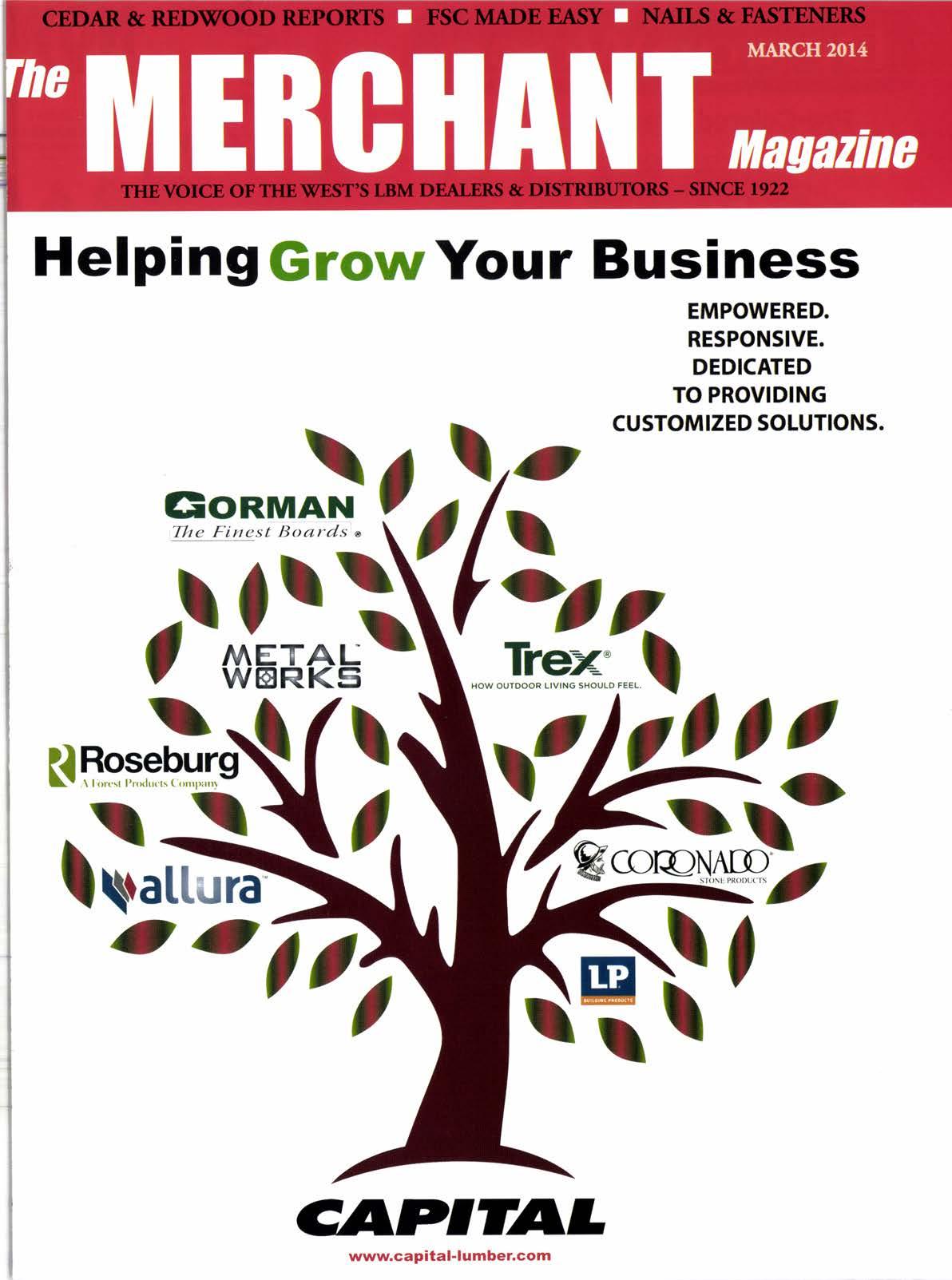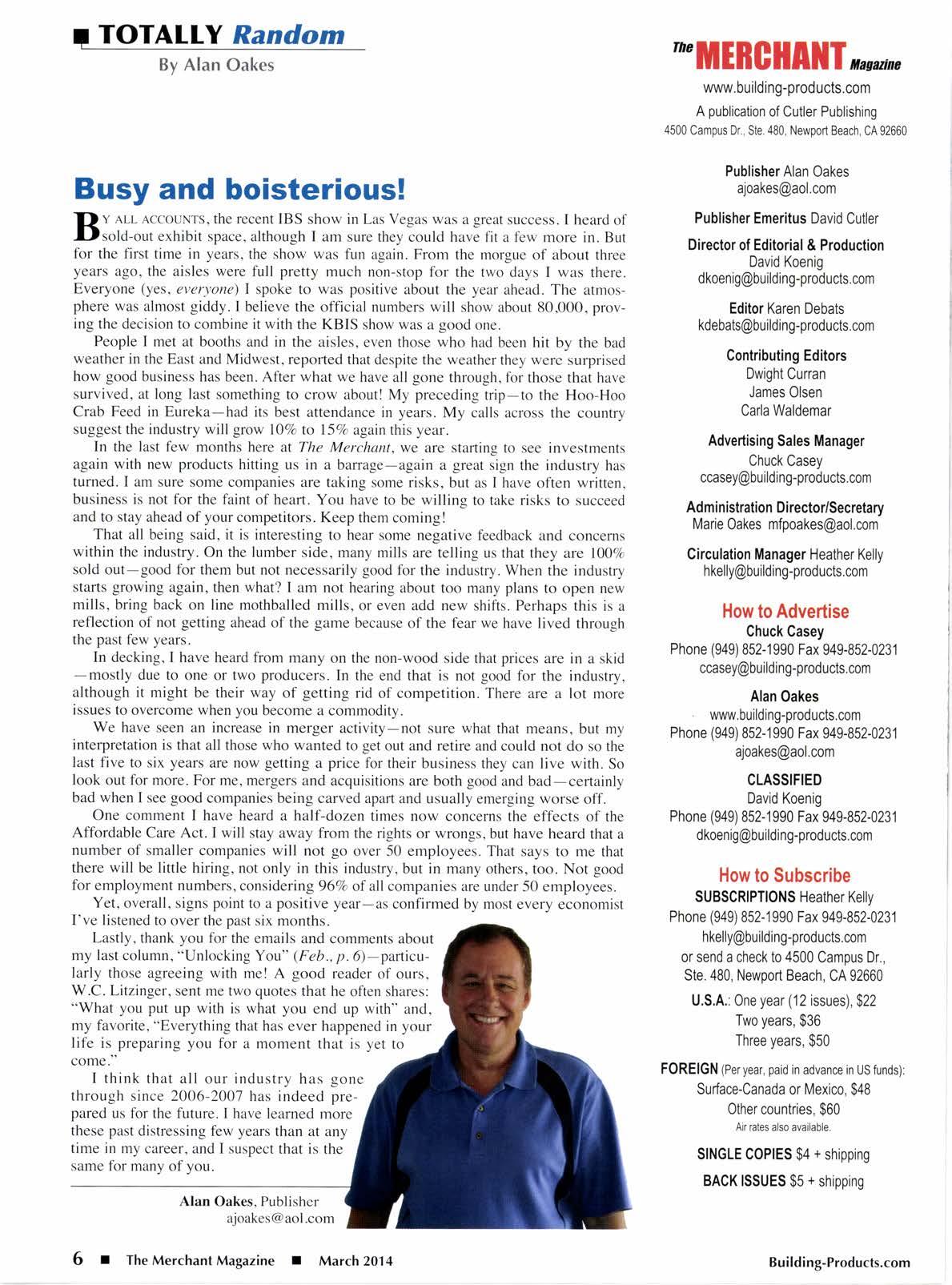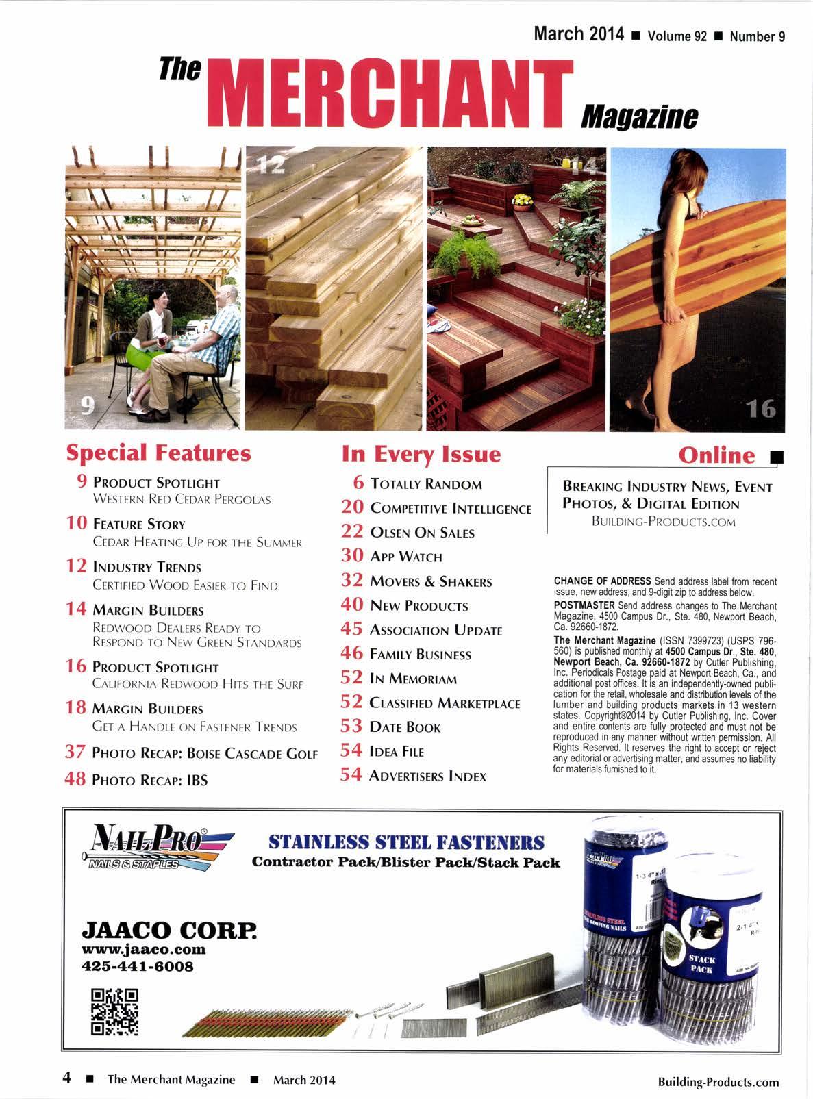 The Merchant llagazine (ISSN 7399723) (USPS 796560) is published monthly at 4500 Campus Dr., Ste. 480, Newport Beach, Ca. 92660-1872 by Cutler Publishing, Inc. Pedodicals Postage paid at Newport Beach, Ca., and additional post oftces. lt is an independently-owned publication for the retail, wholesale and distribution levels of the lumber and building products markets in 13 western states. Copyright@2014 by Cutler Publishing, Inc. Cover and entire contenls are fullv orotected and must not be reproduced in any manner without written permission. All Rights Reserved. lt reserves the right to accept or reject any editorial or advertising matter, and assumes no liability for materials furnished to it.
