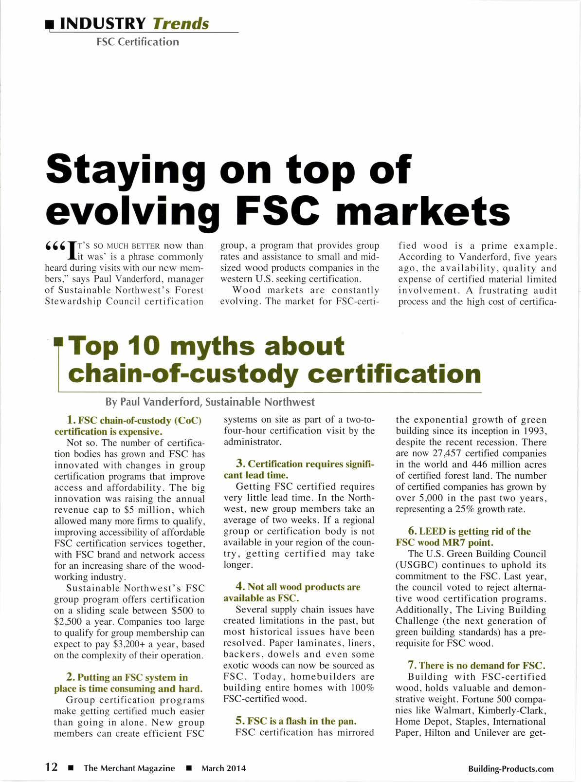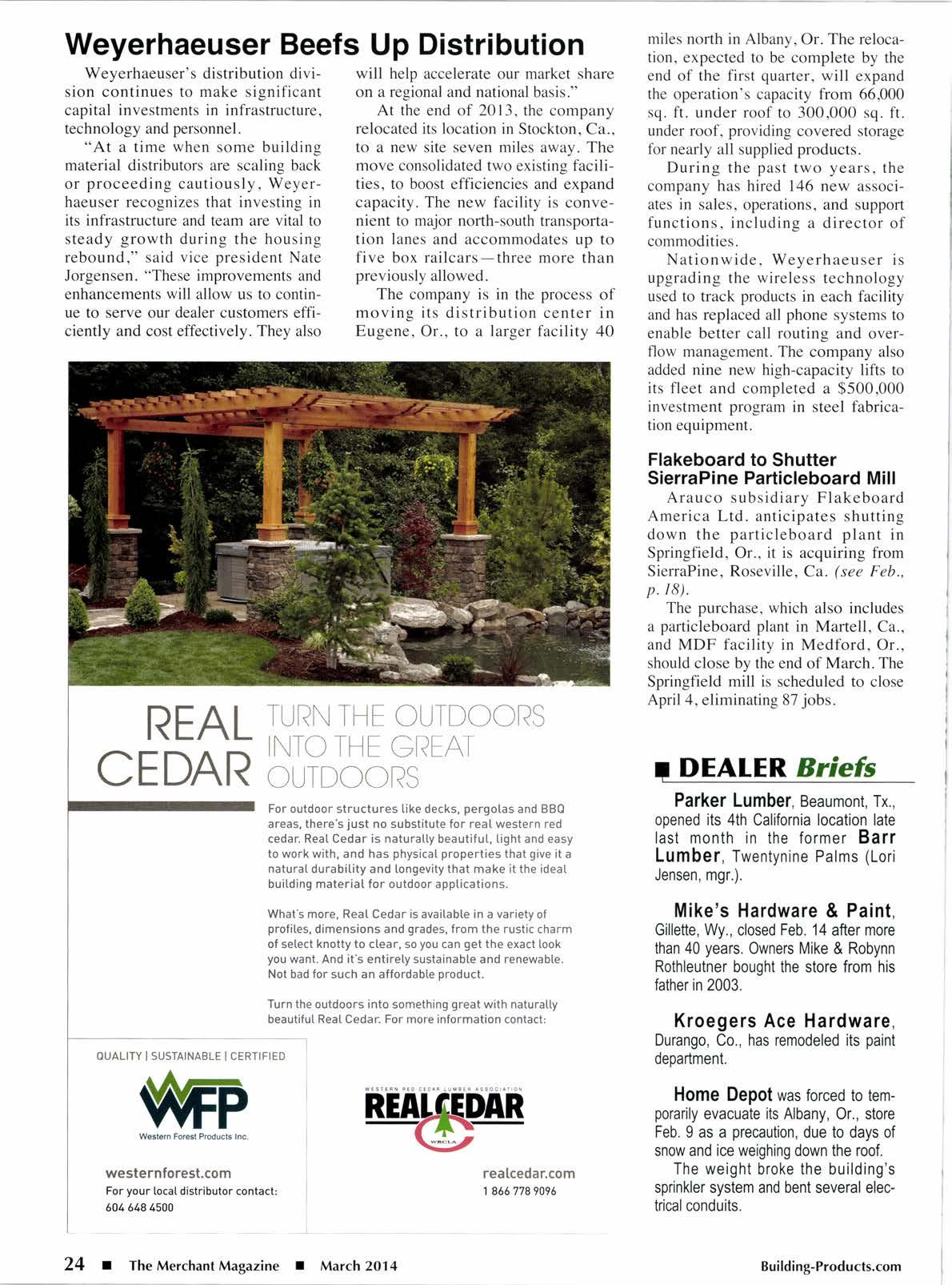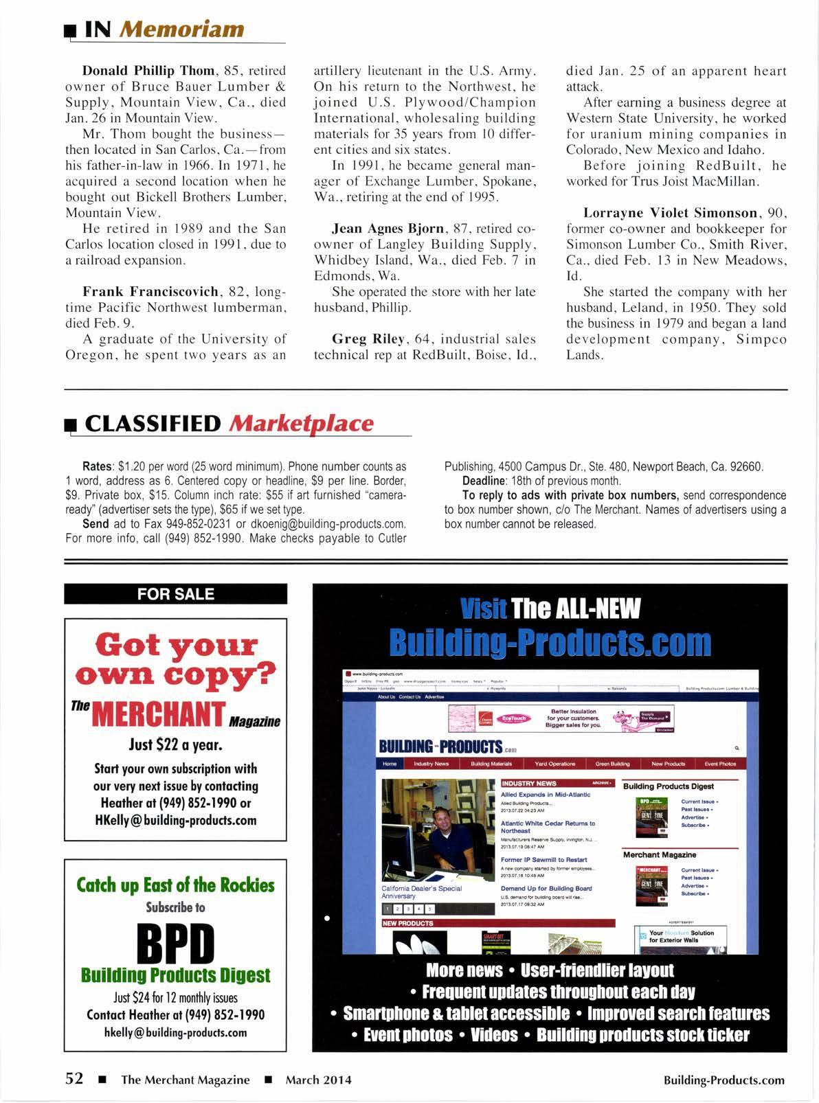 The Merchant llagazine (ISSN 7399723) (USPS 796560) is published monthly at 4500 Campus Dr., Ste. 480, Newport Beach, Ca. 92660-1872 by Cutler Publishing, Inc. Pedodicals Postage paid at Newport Beach, Ca., and additional post oftces. lt is an independently-owned publication for the retail, wholesale and distribution levels of the lumber and building products markets in 13 western states. Copyright@2014 by Cutler Publishing, Inc. Cover and entire contenls are fullv orotected and must not be reproduced in any manner without written permission. All Rights Reserved. lt reserves the right to accept or reject any editorial or advertising matter, and assumes no liability for materials furnished to it.