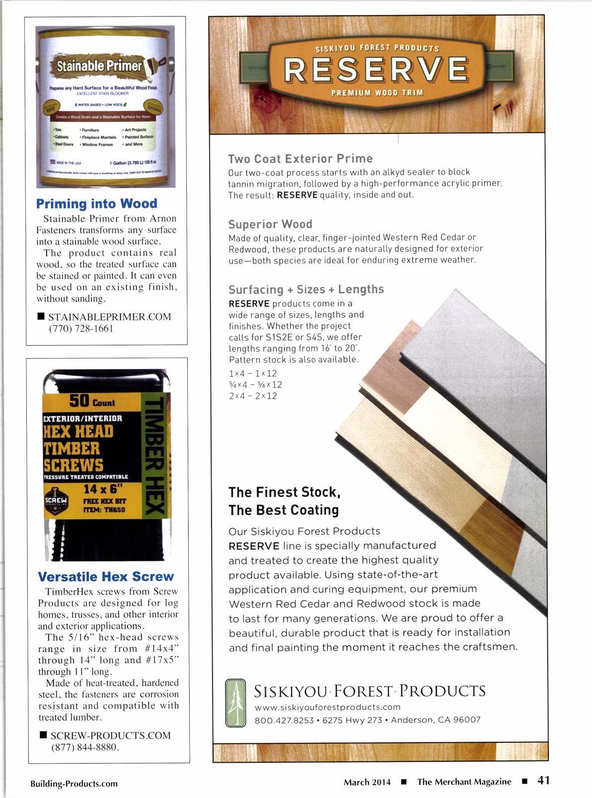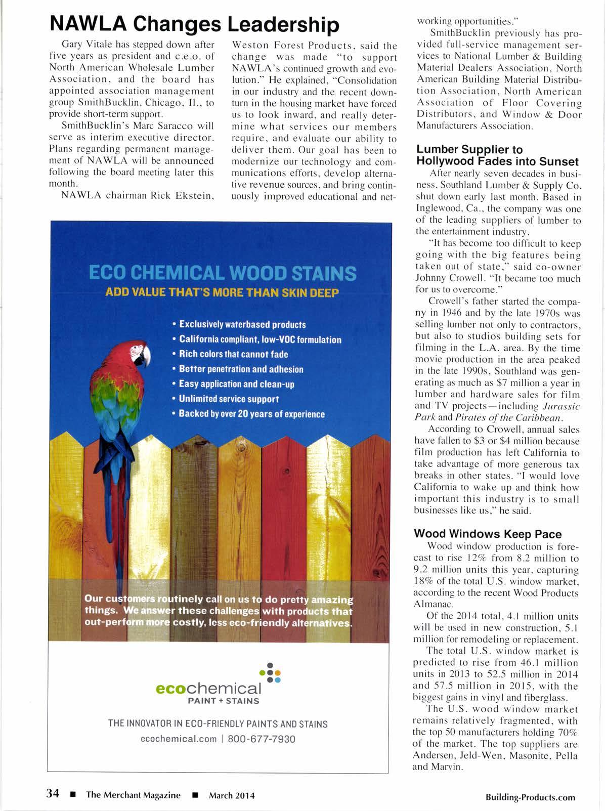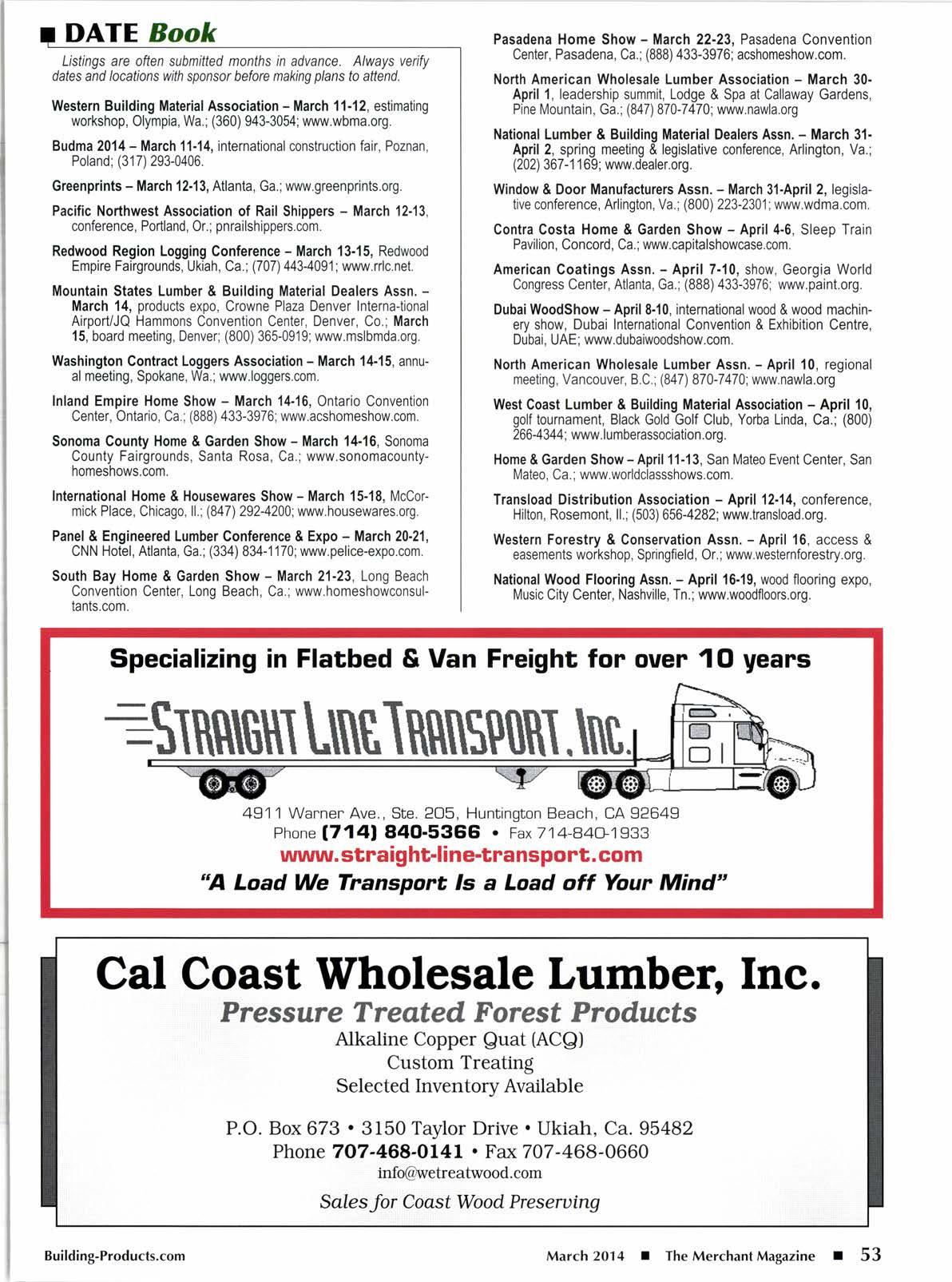 1O years 4911 Warner Ave., Ste. 2O5, Huntington Beach, CA 92649 Phone 17141 840-5366 . Fax 714-a4C-1933 www. straight-line-transport. com "A Load We Transport Is a Load off Your Mind' Cal Coast 1llholesale Lumbet Ine. ;1,1,, Pressure Treated Forest ?roducts ,: , , Alkaline Copper Quat (ACg) Custom Treating Selected Inventory Available P.O. Box 673 . 3150 Taylor Drive Ukiah, Ca.95482 Phone 7OZ -468-0141 Fax 707 -468-0660 s"rn;ffiil:#:;eruins Building-Products.com March 2014 I The Merchant Magazine I 53