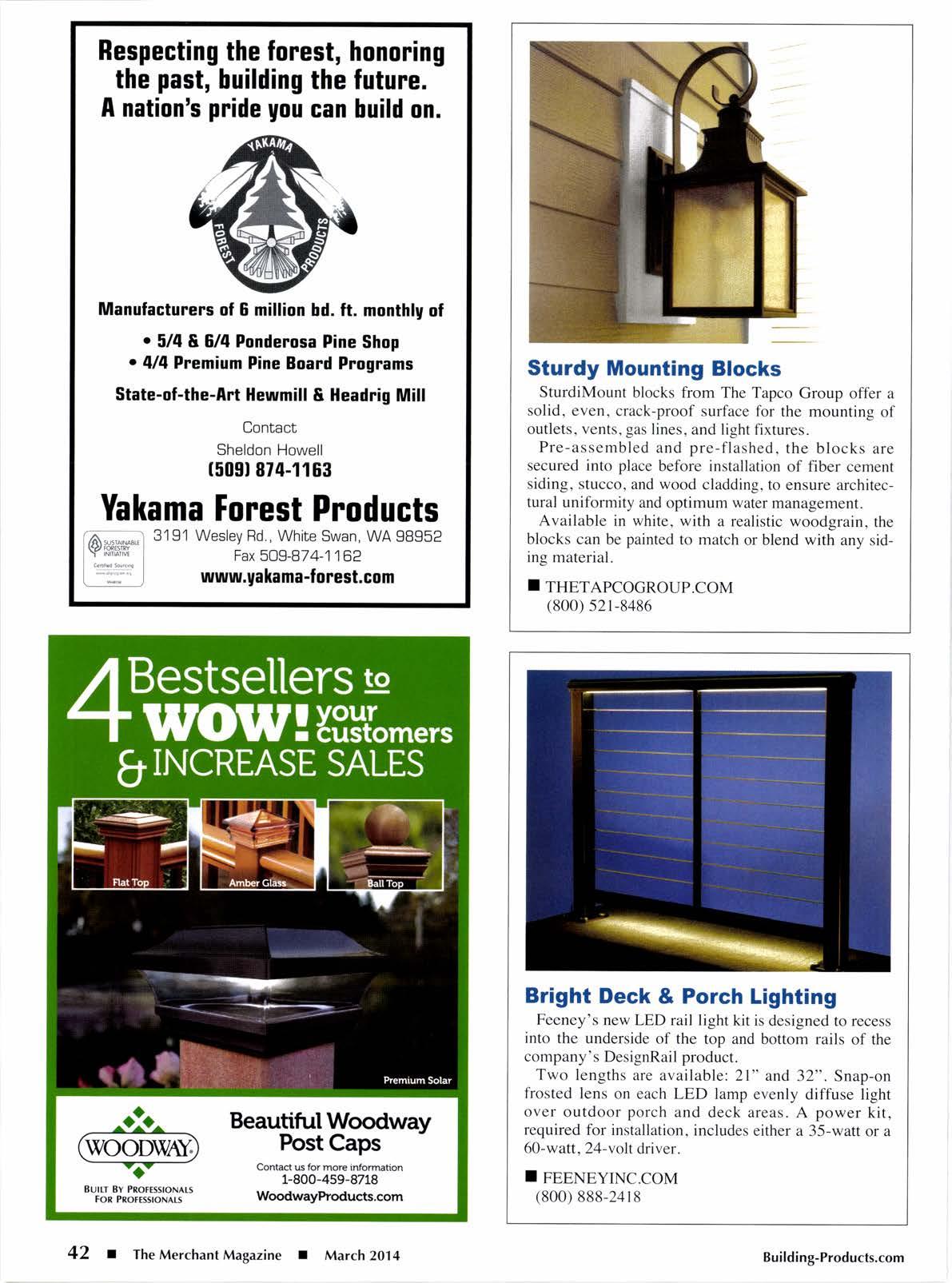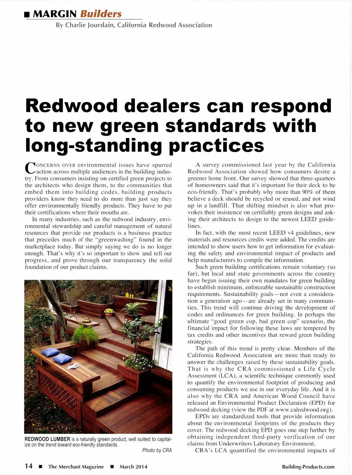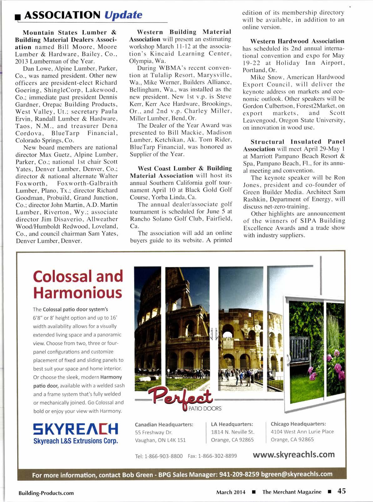 1O years 4911 Warner Ave., Ste. 2O5, Huntington Beach, CA 92649 Phone 17141 840-5366 . Fax 714-a4C-1933 www. straight-line-transport. com "A Load We Transport Is a Load off Your Mind' Cal Coast 1llholesale Lumbet Ine. ;1,1,, Pressure Treated Forest ?roducts ,: , , Alkaline Copper Quat (ACg) Custom Treating Selected Inventory Available P.O. Box 673 . 3150 Taylor Drive Ukiah, Ca.95482 Phone 7OZ -468-0141 Fax 707 -468-0660 s"rn;ffiil:#:;eruins Building-Products.com March 2014 I The Merchant Magazine I 53