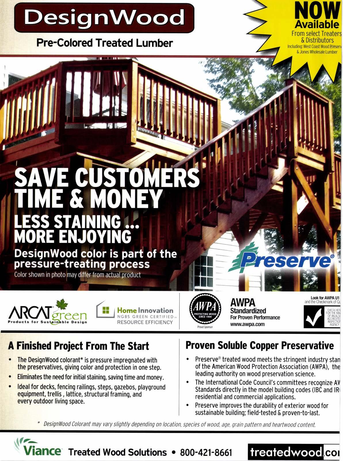 Pre-Colored Treated Lumber NOW Available From select Treaters & Distributors Including: West Coast Wood Preseru & Jones Wholesale Lumber lrt | !! , Home Innovation l-J i.f.?s,..?ia\ 1..i,..! :) RESOURCI EFFICI[NCY AWPA Standardized For Pmven Performance vvww.awpa.com Look forAtirPA Ul anci the 0hecknark ol 0l