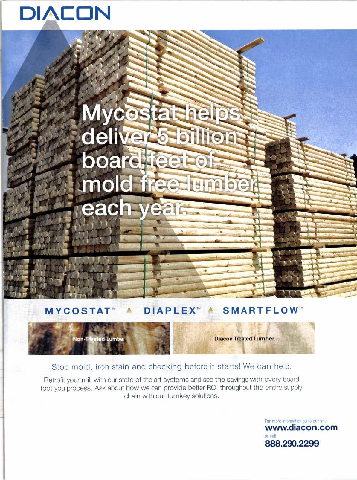 DI/\trEN ,l l,ii li, !,, far i;l: ' :{!"*1v" .9lii,q d - {iirdltl Irlr r,l I www.diacon.com 888.290.2299 P;Id-* MYCOSTAT - DIAPLEX- SMARTFLOW"' Diacon Treated Lumber Stop mold, iron stain and checking before it starts! We can help. Retrofit your rnill with our state of the art systems and see the savings with every board foot you process. Ask about how we can provide better ROI throughout the errtire supply chain with our turnkey solutions.