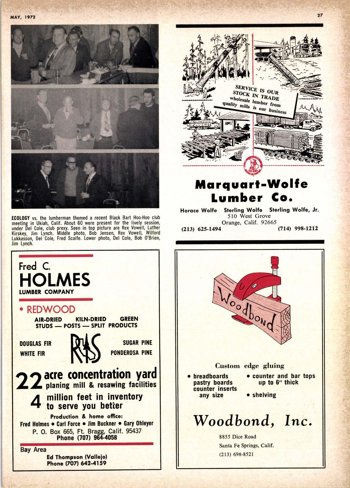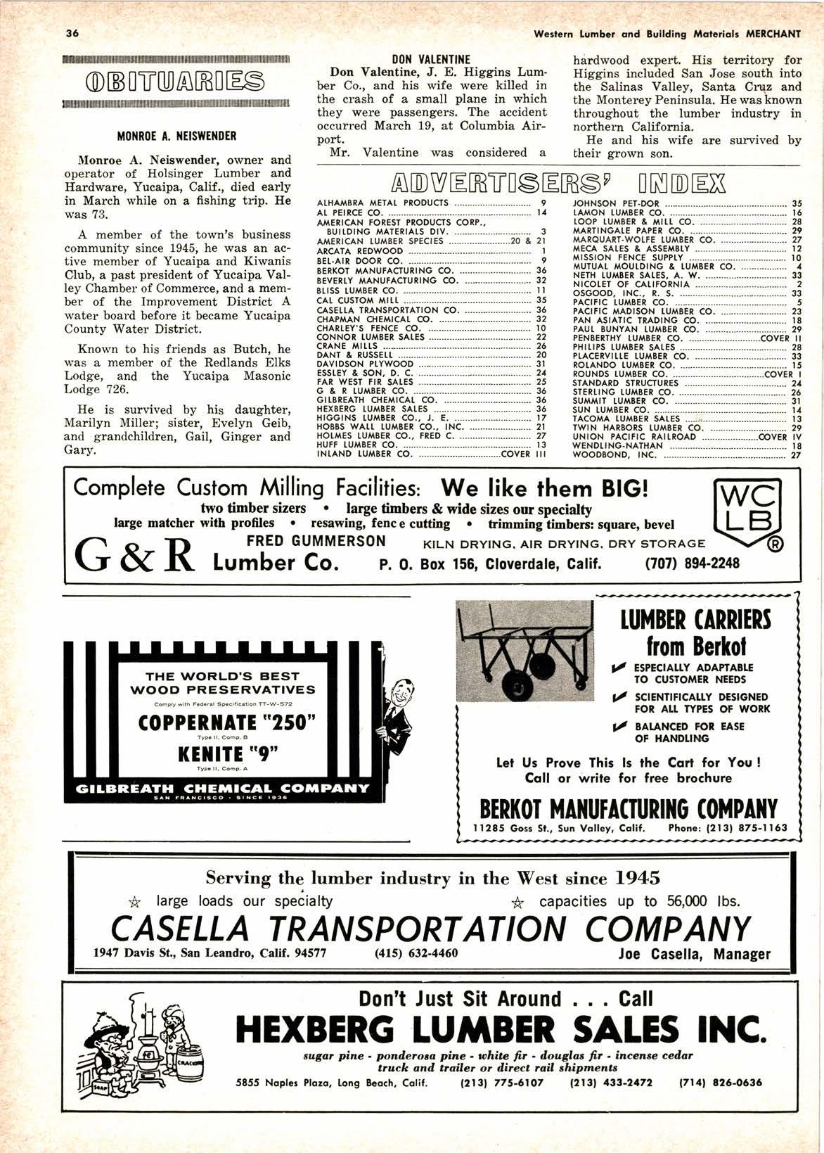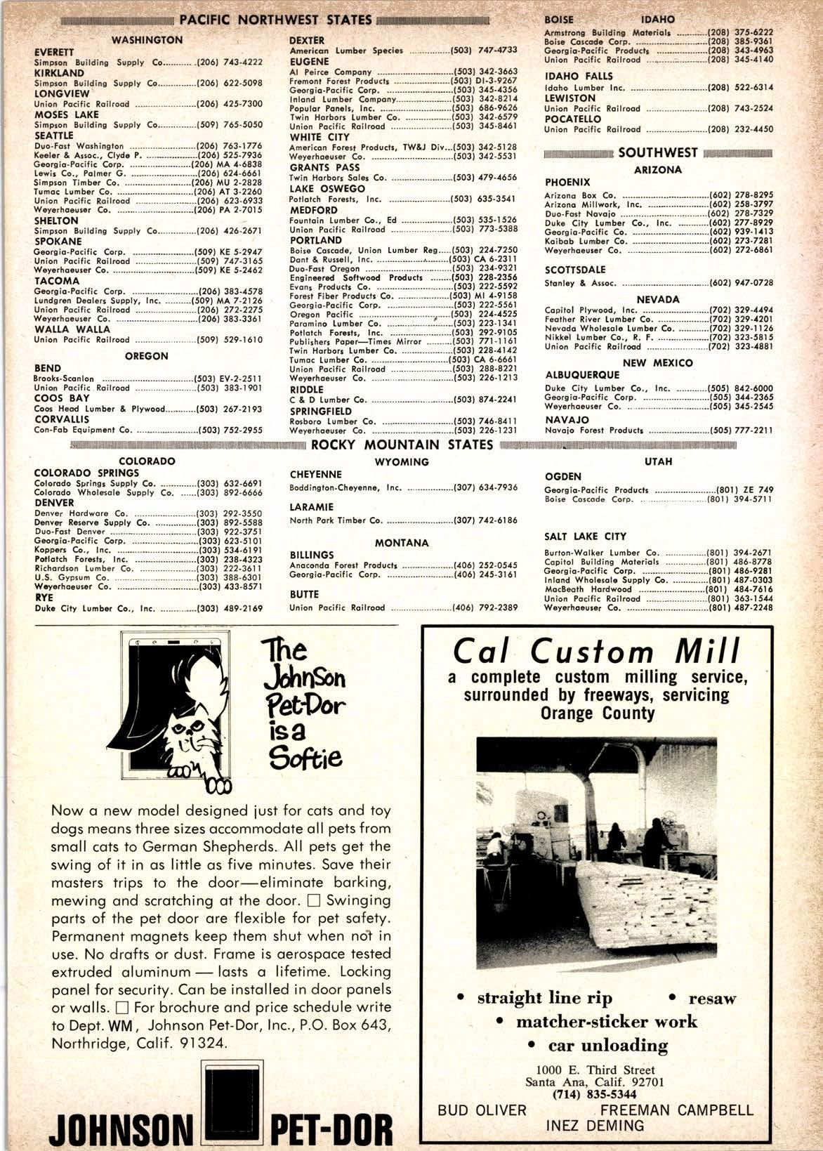 BERI(}I MAilUTACruililO ((II{PAIIY | 1285 Goss St., Sun Volley, Colif. Phone: 12l3f 875-1163 ADVtrRT[StrRSz INDtrX ALHAl,tBtA l{ETAL PRODUCfS ....-.........-..............- 9 Ar. pErRcE co. .......--..-.........--..-.--......--..-........-...... r4 AMERICAN FOREST PRODUCTS CORP., BUttDtNG AAATERTATS DtV. .._.............--........-.. 3 AMERTCAN TUMBER SPECIES --.........-....-......20 & 2l ARCATA REDWOOD -...-......-..--...-.-....-.-............... l 8Er..Art DOOR CO. ........-...-..-.-.....-.-.-..-....-......-... 9 BERKOT IANUFACTURTNG CO. .--.................-.-..... 36 BEVERTY I ANUFACIURTNO @. ..---.-................. 32 8ilSS TUTABER CO. ...-............-...-......-....-.-.......-....- | I cAr. cusToM M|r1. ...-....-....-.....-..-........--.....-......... 35 casEttA TRANSPOTTAITON CO. .......-.......-..-...... 36 CHAPMAN CH€A,llCAL CO. .........-.-..............-.-.-... 32 CHARTEY'S FENCE @. r0 coNNoR rul BER sAr.Es --..-..-- 22 CRANE l,tftts .-.....-..--...---..--.-....26 DANT & RUSSEU. --.--.-.---..-....--. 20 DAVTDSON PTYWOOD .-...-.....-.. 3l ESSTEY & SON, D. C. .--.----...... 21 FAR WEST flR SALES .....-,.,..... 25 G & R tUI{BER CO. ....-.-..-....._...-...-.-..-...............- 36 Gil.BREA'H CHEMTCAt CO. .-.-.......,.....--.--..-...... 36 HEXIERG tUMBEt SATES ................-..-...-...-..-...... 36 HIGGINS lUl,lBER CO., J. E. .......-............-......--- 17 HOBES WAtl [Ur 8ER CO., tNC. -.-.....--.............. 2l HOLA,IES TUMBER CO.. FRED C. ..........---...-...-..-.... 27 HUFF tUl EER CO. ......................-............_...,.-..-..-. r3 tNLAND LUt SER CO. .....-..-.........".............COVER ill .toHNsoN pET-DOR ..._...........-.-........................--... 35 IAr,{ON lUr BEl CO. -..........-................................. l6 r.ooP tullsER & M|lr co. ..................-..........-.... 28 MARTTNGATE PAPER @. -.-.-...-...-........-..-.-.....-.--.. 2q MAROUART.WOtTE TUMBER CO. ..................,....... 27 l,iECA SAf.ES & ASSEI,tBtY .....-.............-......-......... 12 MrssroN FENcE suPPrY ...............-..........-...-.--. l0 MUTUAL A,IOULDING & LUI,IBER CO. ........-..-...--. 4 NETH tUMEER 5AtES, A. W. .-.....-..................-..--. 33 Nrcor.ET ot cAUFoRNTA ......_..-....-...-................. 2 oscooD, rNc., R. s. -........_. 33 PACTFTC rUl SER CO. ..._...._.......__......-...-._.....-.--.. 5 PACTflC l{ADTSON r.Ul{8Er CO. .-........................ 23 PAN ASTATIC TRADTNG CO. --._..--.....-......-....-..... l8 PAUt SUNYAN IUT BER @. ...........................-.... 29 PENSEITHY tUr EER CO. -....._.....,-...-.....-....COVER tl PHItPS tUA/t8ER SATES ......-......-....-.-...................-. 28 P|.ACERVil.tE TUMBER CO. .......,-..................-....-.. 33 ROTANDO tul EER CO. t5 ROUNDS IUT BER CO. .......-.__...._._..-..-.....-..COVEt I STANDARD STRUCIUTES 21 sTERr-f NG TUT BER CO. ......-_... 26 suil ^rT tUMBER co. -...--..--...-..--...__..........-.-....... 3r suN t"uMBER CO. ........-........._..........,.-....-...._-........ l4 TACOI,IA LUA,IBER SATES --..,^.-........-...-......-........-.. I 3 lWf N HARsORS f.Ul,tBER CO. ...-..........-............. 29 uNroN p^crf rc RAt t RoAD --..-.-.......--..--.-@vEt tv wENDr.rNG-NATHAN .............-...-......-..........,._........ l8 wooD80ND, lNc. ................._..........-...............-. 27 THE \^,ORLE''S BEST WOOD PRESER\'ATIVES Compry wirhF.d...l stseiti..tion TT-w-52 COPPERilATE "250'' fyp. rr. comF. B l(EilTE "9" Typ.ll. Comp, a Serving the lumber industry in the West since 1945 * large loads our specialty * capacities up to 56,000 lbs. CASELLA TRANSPORT ATION COMPANY 1947 Davis St., San Leandro, Calif. 94577 (4rs) 632-4460 Joe Casella, Manager Don't Just Sit Around . . . Call HEXBERG LUffTBER SALES INC. sugar pine - ponderoca pine - whin fit - ilouglas fir - incen* cedat truck and ttcilct or dircct rail chipmcnu 5855 Nopfcr Pfozo, lons 8coch, Colif. l2l3l 775-6107 l2ltl 4tg-2172 l7l4l 825.0636