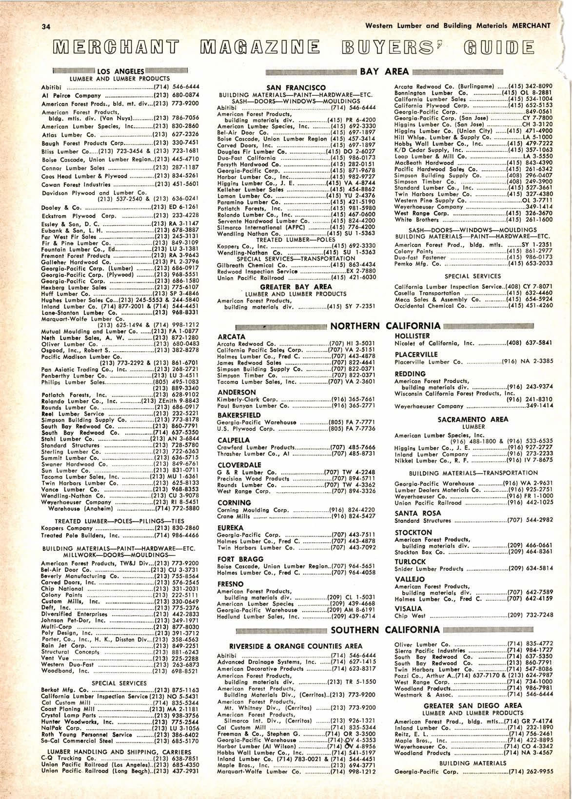 365-7661 Pquf Bunyon Lumber Co. ----.......---.-..--.-(9161 365-277 1 EAKERSFIEID Glorsio-Pocific Worehouro -...------..--..(805) FA 7-7771 U.S. Plywood Corp. ....-..............--.-..-..(805) tA 7-7736 CATPEIIA Crowford Lunbcr Producls----...-...-.-...-.-(7071 185-7666 Thro:her Iumbcr Co., Al .------.----....----.-(7071 185-8731 CTOVENDALE G & R lsmbcr Co. ..-....-..--.--..-...-.t797l fW 1-2218 Prcciiion lr/ood Prod uch --...-(7 O7l 89 1- 57 | 1 Roundr Lumb6r Co. ----------------..-----(7071 fW 1-3362 Wert Rongs Corp. ..-.--.---.-..----------------l7O7l 891-3326 CORNING Cornins Mouldins Corp. -.--.-.--.-..-...---(9161 821-1220 Cronr Mill3 ..............t916) 821-5127 EUREKA Georsio-Pocific Corp. ----.---.-..-------.-....-(7071 113-7 511 Hofmq lumber Co., Fr.d g. -...------------(707l- 113-1478 Twin HtrboB lunber Co. ---------.-.--.--17071 113-7092 FORT ERAGG Boire Cqrcodc, Union [umbcr Rcgion--(707] 964-5651 Holmes Lumbcr Co., Frcd C. ----.-----.--...17071 96,t-,1058 FRESNO Americon For6l Producls, b!ildins nqt riol3 div. ..."...----.--.--.(209) Ct l-5031 Amcri<cn Iumbq Specia .--.-.-...."...-..(209) 139-1668 Georgio-Pqcific Worehousc ..............(209) AM 8-6191 Hedlund Lunbff 5qles, Inc. .-.-.-----.--..-(209) 139-6714 AREA Arcqtq R.dwood Co, {Bu.linsqmc) .---..(415} 342-8090 Bonnington Lumbcr Co. --------...-...(,{15) Ot 8-2881 Crtifornio Lunber Sqler .-----.-.....--...----(41 5) 53,1- I 004 Cotiforniq Plywod Corp. ..-...----..---.-...(415) 652.5153 Gcorgio-Poclfic Corp. .-..------..----.....-....-.-...-.-.8/t9-0561 Gcorsiq.Pocific Corp. (5on Jopl ------.--.---.----CY 7-7aOO Higgin! [umbor Co. (Son Joro) ----.---.--..-.---.-CH 3-3120 Higslnr Lumbcr Co. (Union Cilyl ------(415) 17'l-1900 Hill Whlrc, lumber & Supply Co. .---------------l,A 5-l0OO Hobbr Wqll lumber Co., Inc. .....-..--.-(4151 179-7222 K/D 6dor Supply, Inc. .-...................-..(41 5) 357-1063 Loop lumber & Mill Co, LA 3-5550 MocBqolh Hqrdwood .-----.-..--.--...-.--....(415) 843-4390 Pqclflc Hordwd sqlcr co. ......-.--.---(415) 261-5312 Simp.on Euildins Supply Co. ...,-.-.--,-(408) 296-019, Simp.on Timber Co. ....-....-.....-.--...-..(/t0g) 249-3900 Slondord Lumbrr Co., In<. .---.......-.-----(415) 527 -3661 Twin Horbors lumber Co. .-.-.------.------(/al 5) 327-1380 Wc5lern Pine Supply Co, OL 3-7711 Weyerhocurer Conpony ----319-1111 Wat Ronse Corp. ..---..---.--...----.....-(fl51 326-3670 White Brothen .,..--(4151 261-1600 SASH-DOORS-Wr NDOWS-MOUl,Dl NGS BUI TDI NG MATERIAI.S-PAI NT_HARDWARE_ETC. Americon For6t Prod., bldg. mtls. --------SY l -2351 Cofony Poinls .--,..--..(415) 861-2977 Duo-fo5t Fo3lser -.(415) 986-0173 Pemko Mfs. Co. .......-..----....--...-.--....-.-.(415) 653.2033 SPECIAI SERVICES Coliforniq lumbcr Inrpection Senicc--(408] CY 7-8021 Cosello Trcnrportoiion .---------------.---- ---(11 51 632-4,460 l,{eco Sql* & Arrcmbly Co. --"-.---..(itl5} 651-5921 Occidentql Chsmlcol Co. ----...-..----..----..(/tl 5) 151 -1260 NORTHERN CALIFORNIA HOITISTER Nicolct of Collfornio, lnc. ...-..-----.-...(4081 637-5841 PTACERVIUE buildins moteriol3 div. .-....--....-......-(916, 213'9371 Wilconrin Colifornio Foral Produclr, Inc. (9r61 241-8310 Wey€rhoouict Compony .....--...........--.-------.--.--349'l'll 4 SACRAMENTO AREA LUl,tBER Amcricn lumbq SpGciar, lnc. (el6l ,188.1800 & (916) 533-6535 Hissln! Lumb€r Co.. J. E. .---..--....-------.(9161 927-2727 fnf,ond Lumbsr Compony .------.----..-----(916) 273'2233 Nikkef Lumber Co., R. F. --------.-...--.----(916) lV 7-8575 BUI IDI NG MATERIATS_TRANSPORTAIION Gcorgio-Pqcific Wqrchourc .--.---..-...-(916) WA 2'9631 Iumber D4lert Motcriqlr Co. ----------.-.(916] 925-2751 Weyorhoquser Co. .......---.-...--.-----.--.--..-(916) FR t.1000 Union Pocific Rqilroqd .-.---..-.--.---..---..t916) 112'1O25 Plocqville lumber Co. REDDING Amcricon Forsl Producls, ..,......(9r6) NA 2-3385 SANTA ROSA Stondord Structurcr .-.--...----------.----- -..(7071 511'2982 STOCKTON Americqn Forerl Producir, buildins mofcriotr div. ------..-.-.--.----.(2091 /166-0661 Stockion Box Co. .--...----------.------.-.-.-.---(2091 161'4361 TURTOCK Snider lumbsr Productr ---.......--.--.------..(209) 534-58lrl VAIIEJO Amrriccn For6l Pbducti, buifding mqtsiolr div. --.---..-.-.--....(7O71 612-7589 Hofmq lunbs Cr., Frcd C. .-----------(7071 612-1159 vrsAuA Chip Wat ......-......-(209) 732'7218