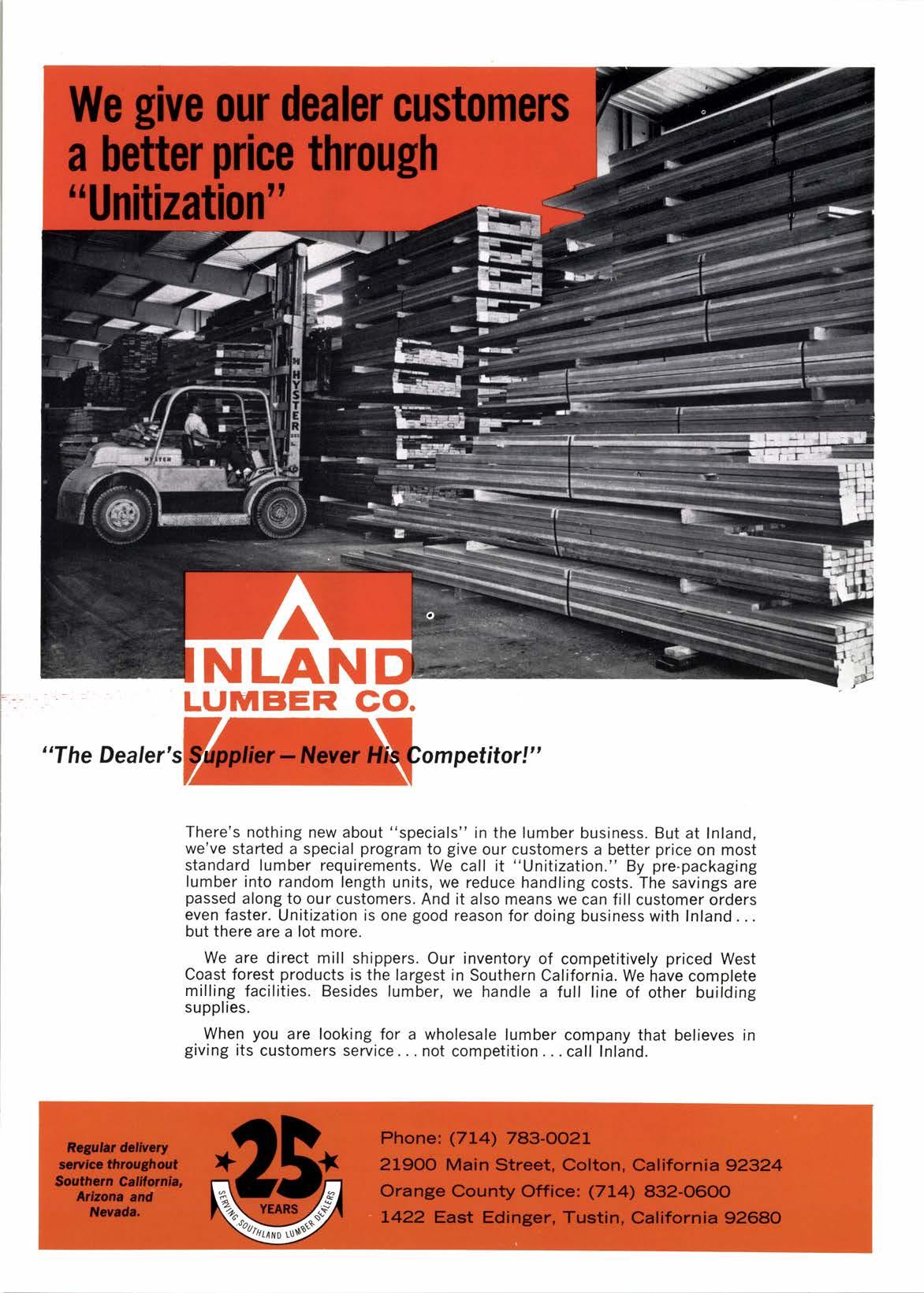 There's nothing new about "specials" in the lumber business. But at lnland, we've started a special program to give our customers a better price on most standard lumber requirements. We call it "Unitization." By pre-packaging lumber into random length units, we reduce handling costs. The savings are passed along to our customers. And it also means we can fillcustomer orders even faster. Unitization is one good reason for doing business with Inland... but there are a lot more.