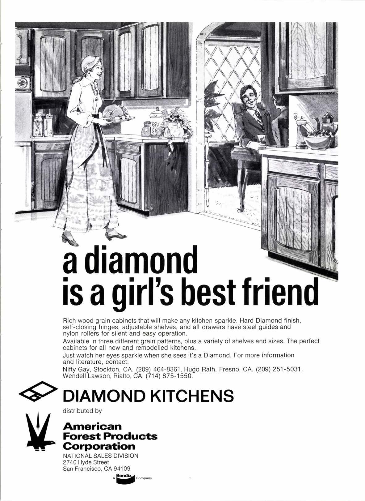 Rich wood grain cabinets that will make any kitchen sparkle. Hard Diamond finish, self-closing hinges, adjustable shelves, and all drawers have steel guides and nylon rollers for silent and easy operation. Available in three different grain patterns, plus a variety of shelves and sizes. The perfect cabinets for all new and remodelled kitchens. Just watch her eyes sparkle when she sees it's a Diamond. For more information and literature, contact: