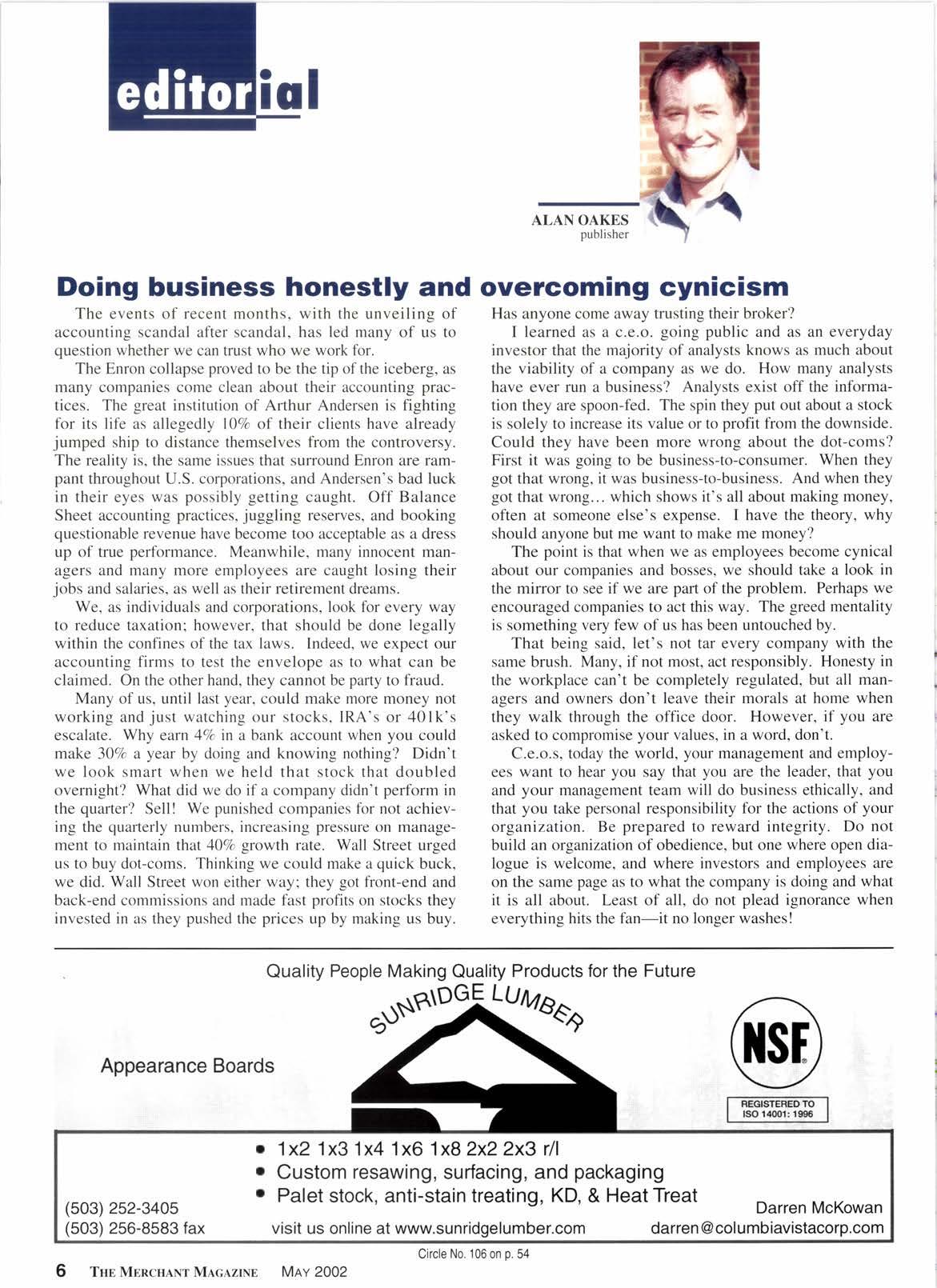 @ rffiFl Itsot.oor:rg I c\\ A4s€? 6 Quality People Making Quality Products for the Future t 1x2 1x3 1x4 1x6 1 x8 2x2 2x3 rll r Custom resawing, surfacing, and packaging (503) 252-3405 r Palet stock, anti-stain treating, KD, & Heat Treat o"rren McKowan (503) 256-8583 fax visit us online at www.sunridgelumber.com darren@columbiavistacorp.com Circle No. 106 on o. 54 Tnn MnnculNr Mlclznn Mav 2002