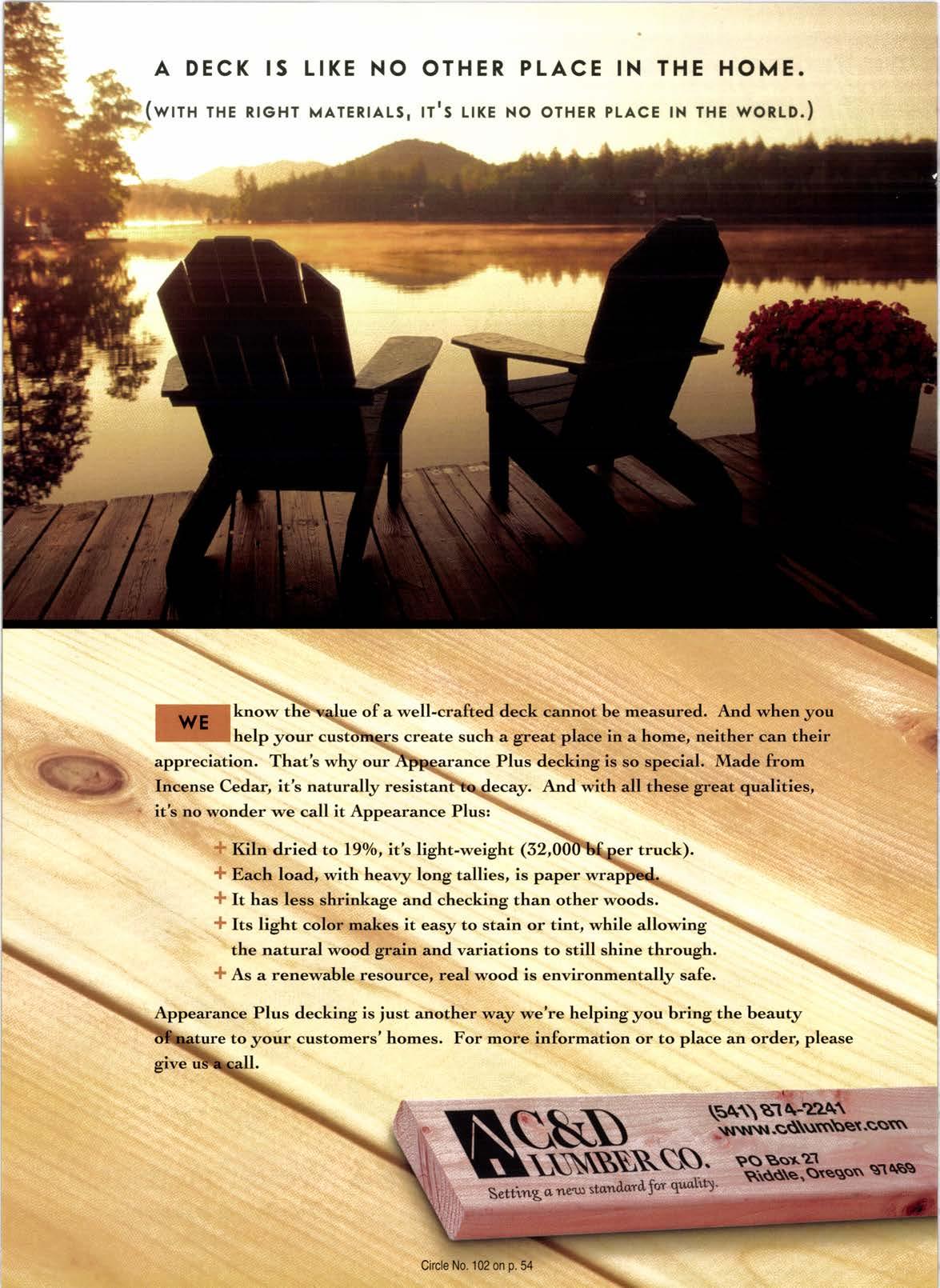 ,^,F know the value of a rt,ell-crafted deck cannot be measured. And when you help your customers create such a great place in a home, neither can their appreciation. That's s'h;,our Appearance Plus decking is so special. Made from Incense Cedar, it's naturally resistant to decay. And rvith all these great qualities, it's no n'onder r'r,'e call it Appearance Plus: