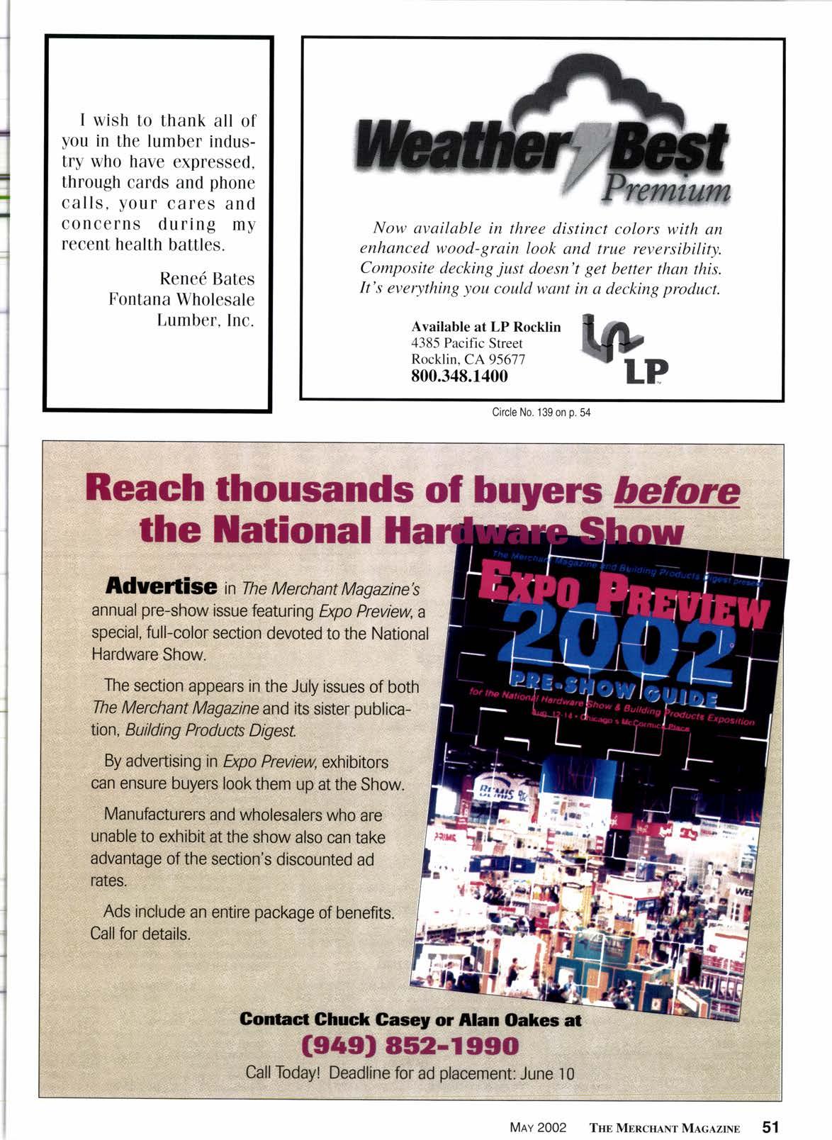 Serving building products retailers and wholesale distributors in 13 Western states-Since 1922 Moy 2002 \TE, COU GUARANTE,E THE' VIE '.a ..,t= Guaranteed to last tTDenty years, Weyerbaeuser ChoiceDek' is the ",tirtually maint e nan ce -fr e e co mp o site d e ckin g product. Designed for both beawty and durability, ChoiceDek'is bwilt for living. ChoiceDek@ gives you / different grain options Ut ' to choose from. Choosc \Wiselv. Choosc ChoiceDck' www.choicedek.com . 877 -235-6873 A \Teyerhaeuser The future is grouing'" fact!red by Advanced Environmental Recyc ing Technologies (A.E.R.T.) under U 5 Patent #5759680 and covered under NER,595 Circle No. 101 on p. 54
