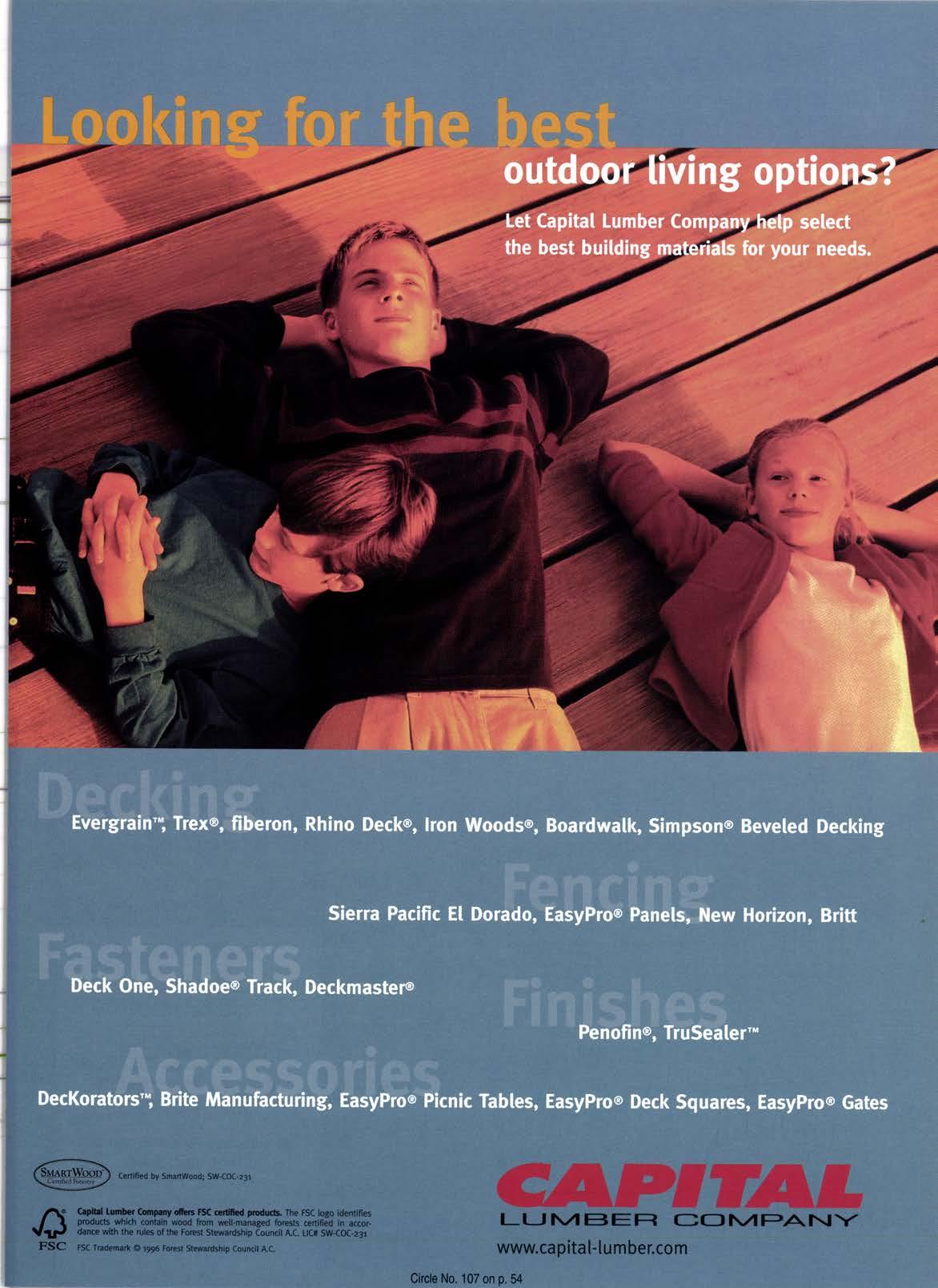 " / )J'o'n/-&, I ffi ;m t1 Capital Lunbe. Company otr€6 FSC certified products. The FSC logo identifles products which contain wood kom well-managed iorests certified in accor dance with the rules of the Forest Siewardship Council A.C. LiC# SW-COC.211 FSC Trademafk O i996 Fore5t Stewardship Council A.C. L_I-J I\.4 B E FI CO N/4PAI\Y www.ca pita l- [um ber.co m Circle No. 107 on p 54