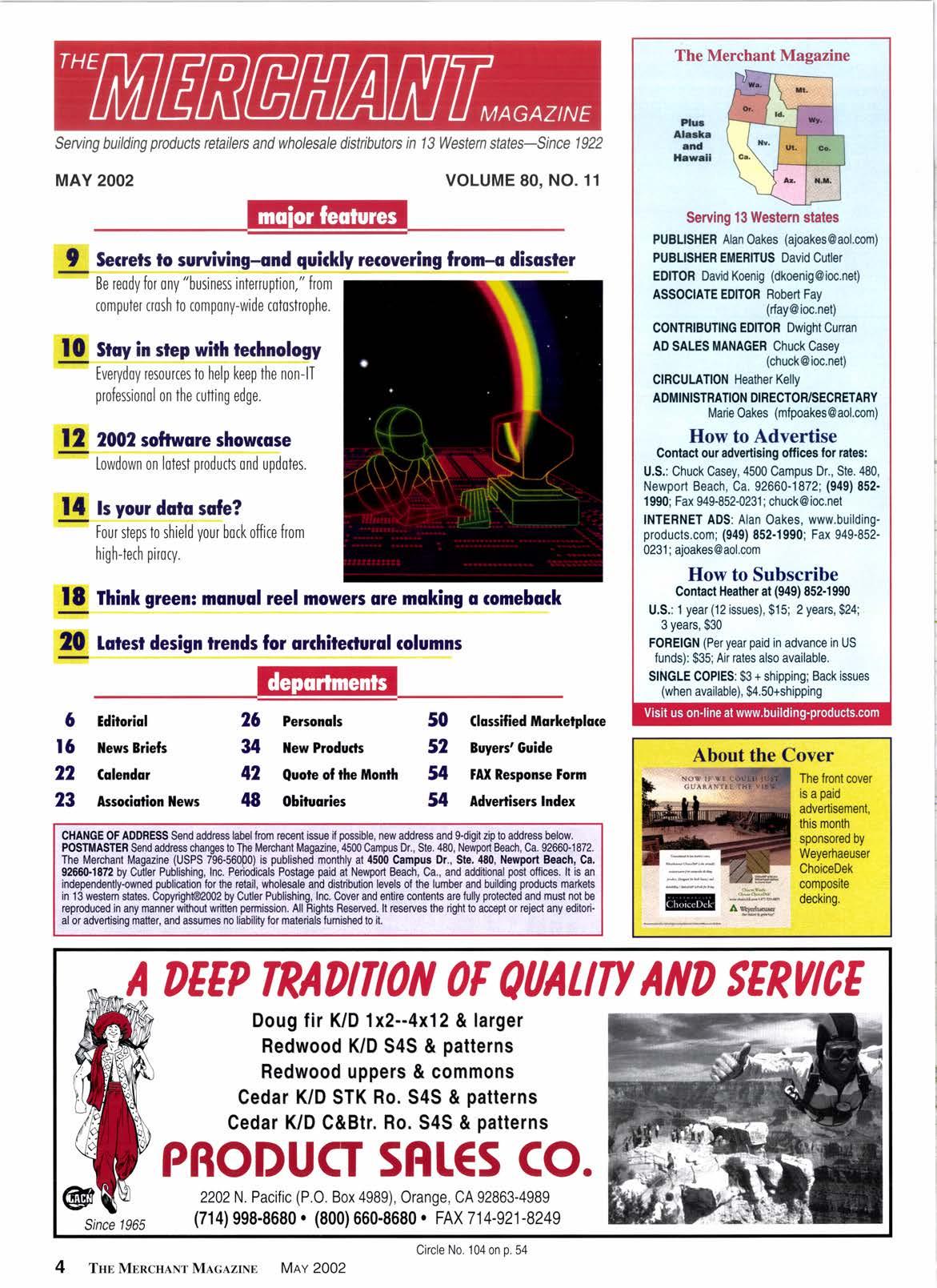 4811, tlowpod Beach, Ca, 9266{1.18?2 by Cutsr Publishing, lnc. Periodicals Postage paid at Nev{pon E*ch, Ca., and additional posl of{bes. lt is an indep€nd€ntly{wned publi€tion tor h€ retail, wholesale and distribdion levels of ths lumber and buibing poduds markets in 13 wsSem states. Copydghl@zoo2 by Cutler Publishing, lrr. Cover and entire contents ar€ fdty proted€d and musl not bo r€produced in any nanner vyithout willen pormission. All Rights Rossrysd. lt rcserves the dght to accsl or reiecl afty €ditorial or advertising matter, and asumes no liability lor materials fumbhed to it. About the Cover The lront cover is a paid advertisement, this month sponsored by Weyerhaeuser ChoiceDek composite decking. DEEP IRADITIOII OF QAAUA AilD SERVIfIE Doug fir IUD 1x2--4x12 & larger Redwood lffD S4S & patterns Redwood uppers & commons Cedar K/D STK Ro. S4S & patterns Cedar K/D C&Btr. Ro. S4S & patterns PRODUCT SRTCS CO. 2202N. Pacific (P.O. Box 4989), Orange, CA 92863-4989 (714) 998-8680 . (800) 660-8680, FAX714-921-8249 Since 1965 Circle No. 104 on p. 54 4 Tnn Mnncnlxr MlcnzrNn Mnv 2002