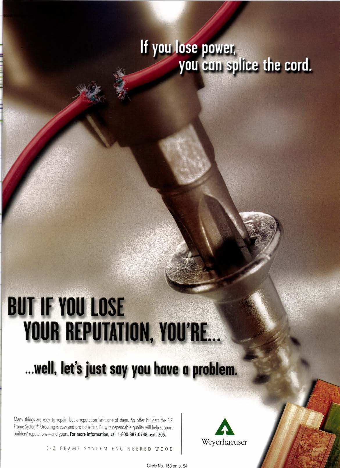 lVlany things are easy to repair, but a reputation isn't one of them. So offer builders the E.Z Frame System9 0rdering is easy and pricing is fair Plus, its dependable quality will help support builden'reputations-and youn. For more information, call 1-800.887-0248, ext. 205. E.Z FRAME SYSTEM ENGINEERED WOOD Circle No. 153 on o. 54 Weyerhaeuser