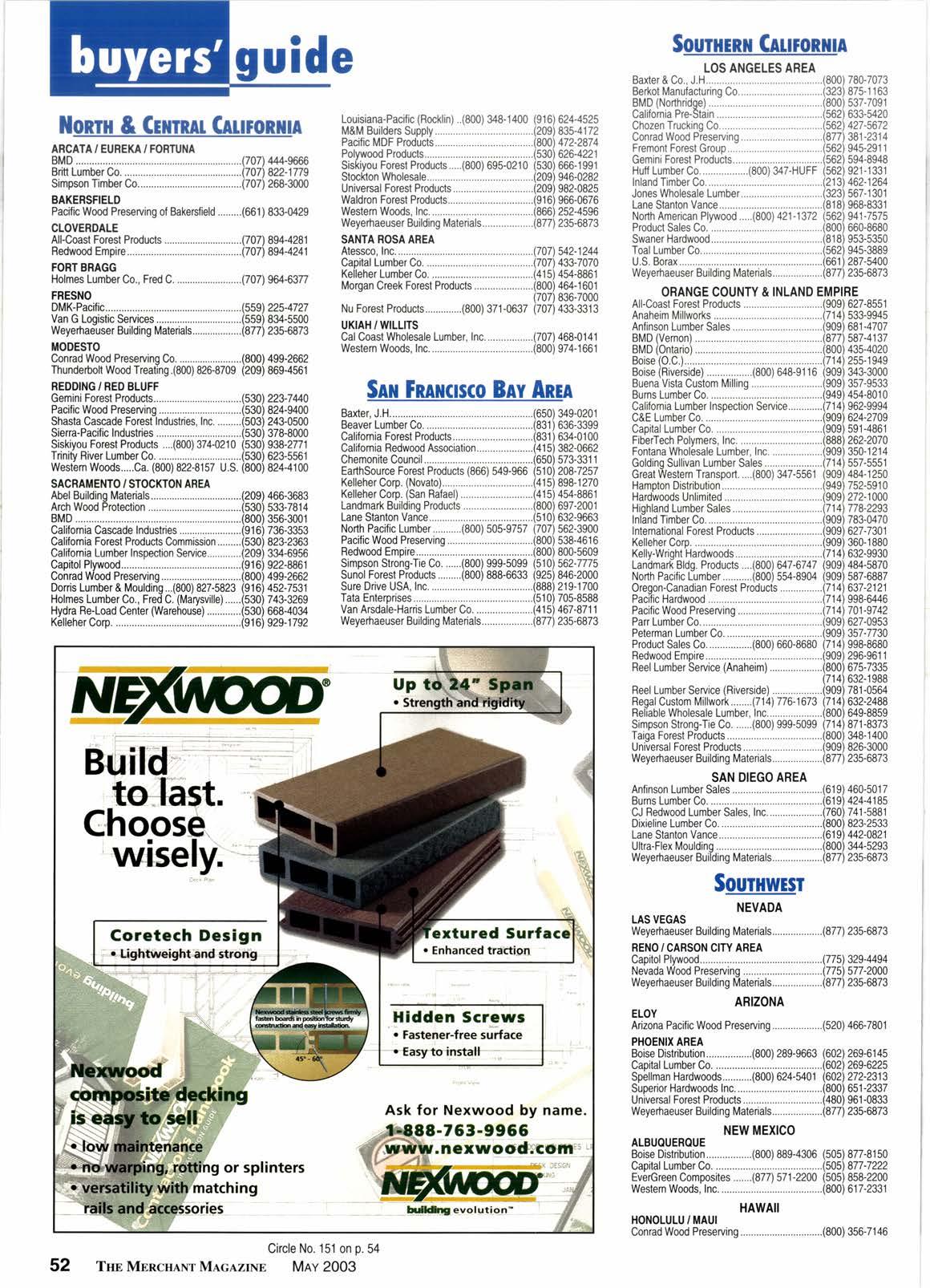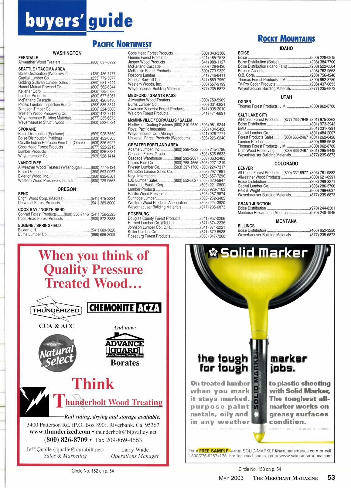 International .........(503) 557-7296 LJB Lumber Sales ...............(800) 552-5627 (503) 620-5847 Louisiana-Pacific Corp. .,.....,.,..,....,.,..............(503) 221-0800 Lumber Products..... ......(800) 926-7103 Pacific Wood Preservin9................................(503) 287-9874 Sunridge Lumber..... ..,.,.(503) 252-3405 Western Wood Products Association.............(503) 224-3920 Weyerhaeuser Building Materials ROSEBURG Montrose Reload Inc. (Montrose).. ...............(970) 244-8301 ...............(970) 240-1 94s MONTANA BILLINGS Boise Distribution ..........(406) 652-3250 Weyerhaeuser Building Materia|s...................(877) 235-6873 When you think of Quality Pressure Treated Wood... Thin Rail siding, drying and storage available. 3400 Patterson Rd. (P.O. Box 890), Riverbank, Ca.95367 www.thunderized'.com . thunderbolt @ bigvalley.net (800) 826-8709. Fax 209-869-4663 Jeff Qualle (qualle@durabilt.net) Larry Wade Sales & Marketing Operations Manager And now:r,TADVANCE IIGUARDI I @ Borates k CCA & ACC Circle No. 152 on p. 54 Htsi# 0n treated hrn$er nrhen you mark it stays marked. purpose paint metals, oily and in any weather to plaotic sheeting wi$ Solid tar|rer, The toughest allmarlre:wor{reon groa*y surfacer condition. 1 .".'. t .t. t':t{,il lft:]:t i,ar', rr:li{, For a E ilSE e-mail SOLID-MARKER@sakuraofamerica com or catt l-800t76-6257x'l 78. For technical specs, go to www.sakuraofamerica.com Circle No. 153 on p. 54 Mnv 2003Tnn Mnncnnnr Mncazrxn 53