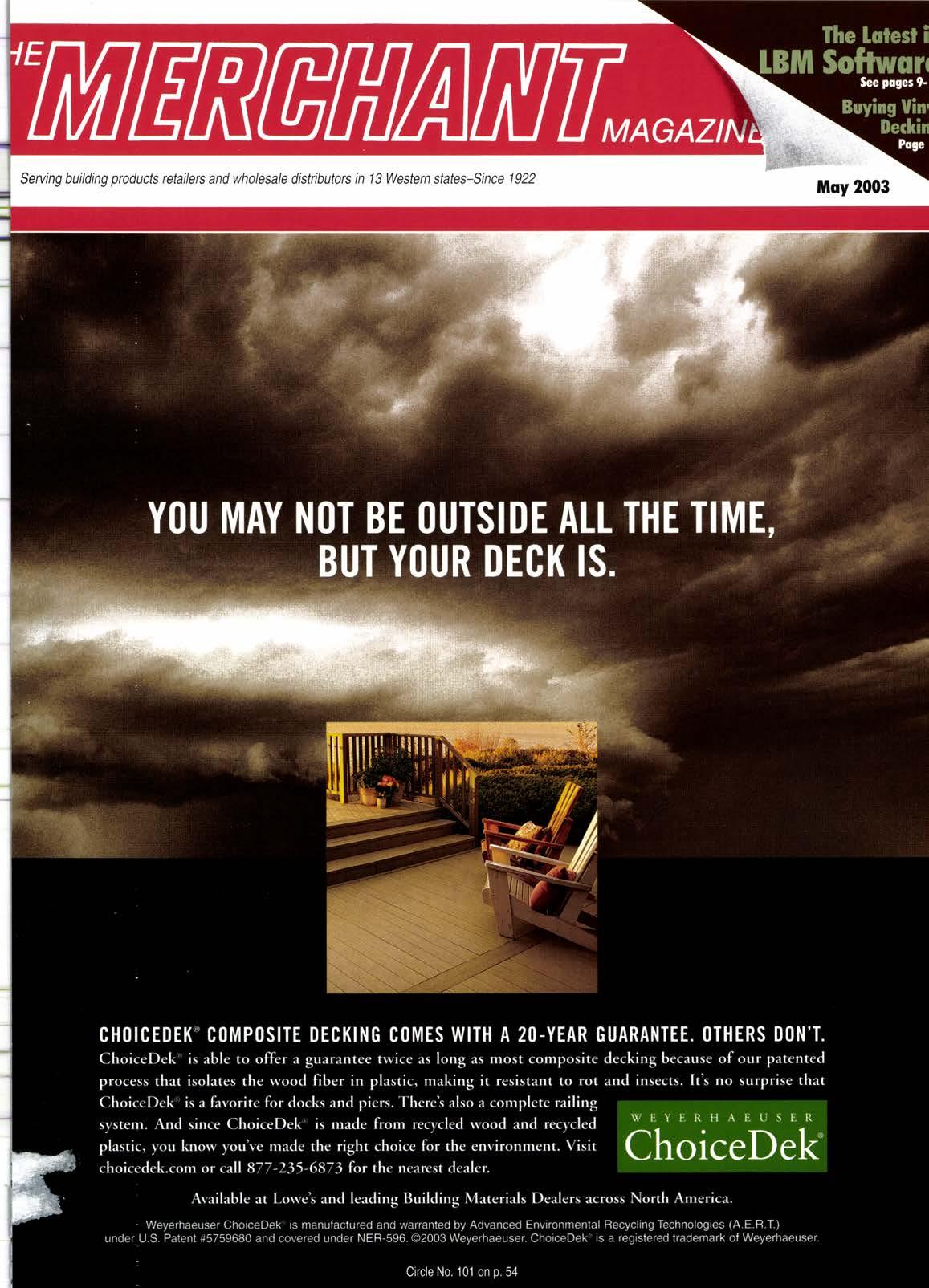 the Cqver Ihe frontcowr is a pad aOveitisemerrt, this msnft sponsorsd by Weyeilaeuser Cfp{x9ek co.lFo€ite 4seldng. detking Whot to look for in o plo$ic deck system. Treoted wood osrociotions to unveil dromatic Since 1965 DOWN TO EARTH REDWOOD COMMONS O REDWOOD REDWOOD TIMBERS O FIR CEDAR CLEARS . CEDAR T PRODUCT SRT€S CO. 221 W. Baywood Ave. (P.0. Box 4989), Orange, CA 92s63-4989 ,Fax714-921-8249,(714) 998-8680 (800) 660-8680 YAruES UPPER GRADES FINISH IMBERS Circle No. 103 on p. 54 4 Tsn Mpncnlxr Macazrxr Mev 2003