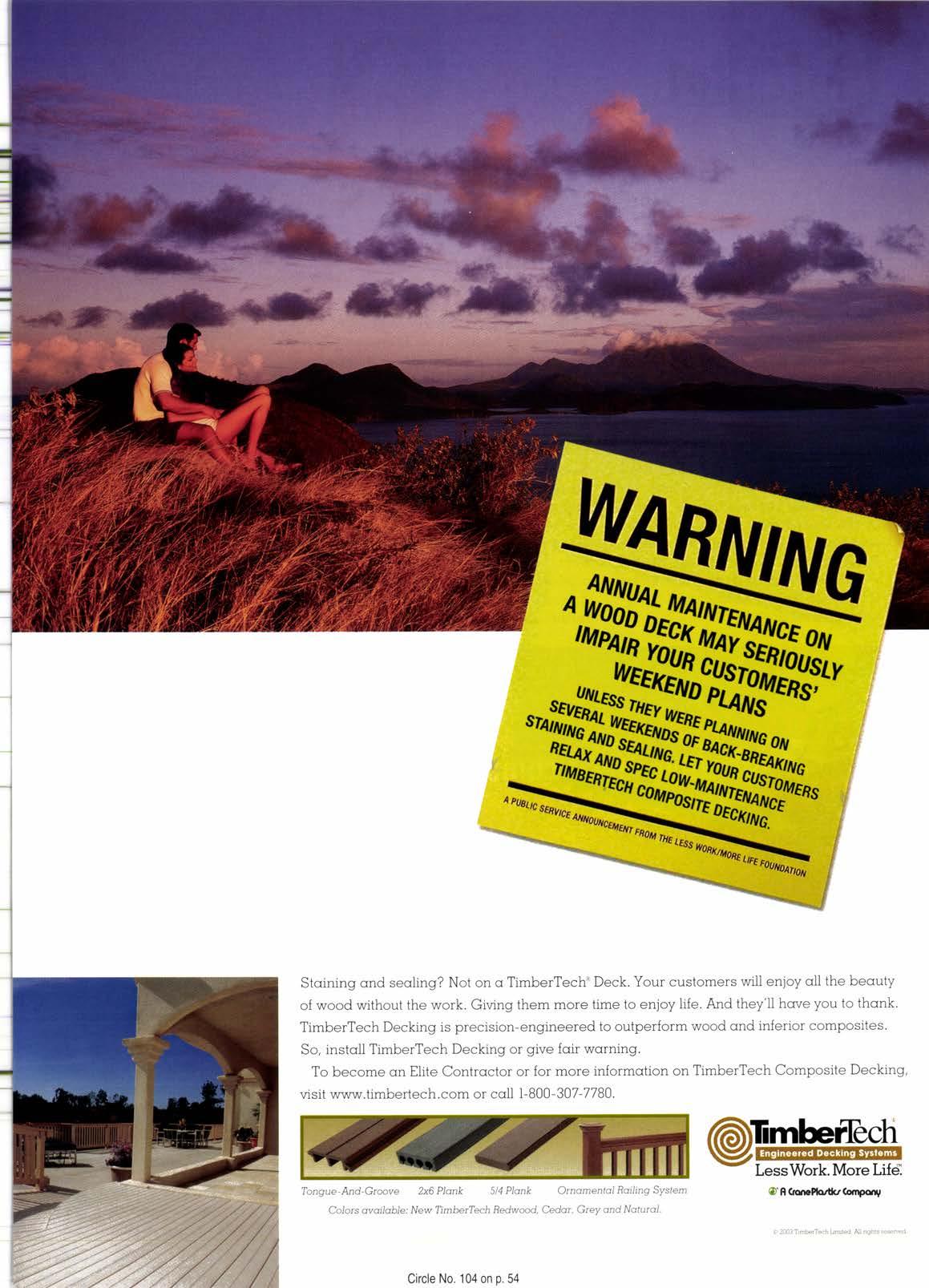 Stolning ond seoling? Not on o TimberTech" Deck. Your customers will enloy oll the beouty o1 wood without the wor k. Ciung them more time to enloy life. And they'll hcrve you to thonk. TimberTech Decking is precision-engtneered to outperform wood ond inlerior composites. So, instoll TimberTech Decking or give foir worning.
