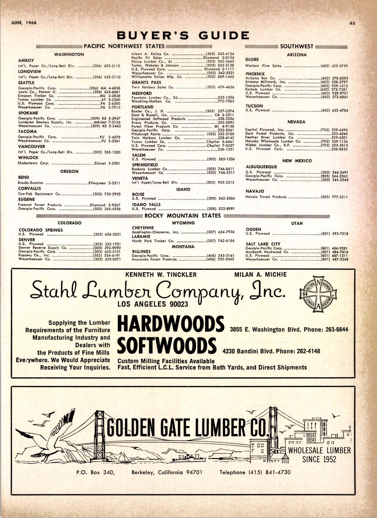 PAUL BUNYAN TUMBER co. Pine oP o Sugar Pine And.erson, California A Mill;i,on Feet to Serae You! "You,rs for the Asl,ci.ng" D*lry and Cornpary o Lumber LCL REDWOOD EDgewood 6-1261 CITY OF INDUSTRY, CALIF. a o CAR LOT I5@O NETSON STREET let Us Prove This Cqll or write I.UMBER ORRIER' lrom Be*of y' ESPESIALLY aDAPtABtE IO CUSTOMER NEEDS y' SC|ENTIFICAITY DESIGNED FOR AtI. TYPES OT WORK y' BatrNcco For EASE OF HANDTING the Cort for You! for free brochure ls ' t t t t L BTRI(OI MAIIUTA(IURIIIO (()MPAilY DIRECT HARDWOOD MILI Representotivee & Whotesalers LUMBERVENEERS Precision Dimension REPRESEl{TII{G: Ihe Atlantic [br. Co.Joston, All Hardwoods llartzell Walnut Inc-Piqua, Ohio, Walnut lumher Williams Brownell Inc.-Asheville, il.C., Furniture Dimension Robinson [br. Go.-l{ew 0rleans, Genuine ilahogany J. H. Monteath Co.-N.Y.C., Rare Woods & Yeneers lryt$IIRII 8687 Wilshire IIARDITOOD BlYd., BeYerly Hills, tl|[IBtR Calif., P.0. Box c||. 727 t 1285 Goss Slreel, Sun Volley, Colif. Phone: 875-l163
