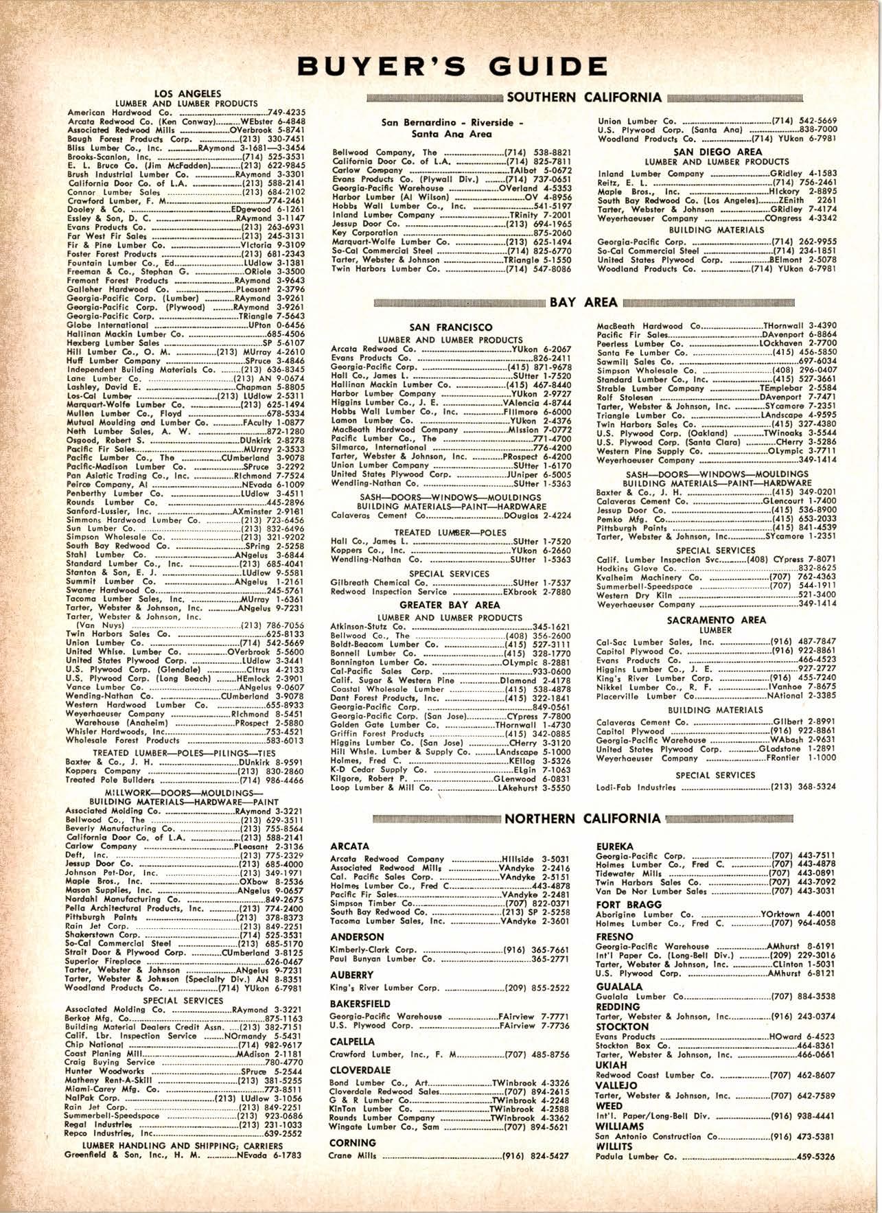 G@€io-PociRc Corp, (Sqn Jose).---..--..-----.CYpnc 7 -78OO Golden Gotc Lumber Co. ......--.---.--.---THornwoll l -4730 Griffin Foresl Prcducls .-.-.-..-.-....---.-.-.-..---.(415) 3,12-0885 Higginr lunbcr Co. (Son Jccl ................CHcrry 3-3120 Hill Whrle. lunber & Supply Co. ........LAndrope 5-1000 Holma, Fred C. .......-...............-...----....-.-KElloe 3-5326 K-D Cedor Supply Co. ..Elgin 7-1063 Kilgorc, Roberl P. .--.......--.-....-.---.---.---Glcnwood 6-0831 loop lumbcr & l,till Co. .-.-.---.......-......-lAkchurt 3-5550 /i{oc8cqth Hqrdwood Co ,....*...--...........THornwoll 3-4390 ....-..-..-..........-DAvonport 6.886,1 Poci0c Fir Porlsr Lunber Co. Sonlq Fe lumber Co. --(415] 456.5850 Sowmill Soler Co. .......-..-..........-..........-......-....697-6034 Simpson Wholesqle Co. ----....---.-..--------.-..(,1081 296-0107 Stondord [umb.r Co., Inc. -.........-.--.-..(/tl 51 527 -3661 Strqblc lunber Crmpony -.-..-......-...TBnplcbor 2-5584 Rolf Slol6q .-...-..D[vapo.l 7-7171 Tqrt r, Wcbilor & Johnson, Inc........-...SY@motc 7-2351 Triongle Lunbcr Co, ...-.....-...-..-.......LAndrcope 4-9595 Twin Hqrborr Solcs Co. .......-..-..........-..-( 11 51 327 -1380 U.S. Plywod Corp. (Ootlondl ...........-TWinoqtr 3-55,14 U,S. Plyv@d 6rp. lsonto Cldrc) ...-.......CH.t.'t 3-5286 W4tqrn Plnc Supply Co. -.-,.-..-......-...glymplc 3-7711 Weyerheurcr Compony -.-.....---..-...-......-..-...349-l 4l 4 SASH-DOORS-Wt NDOWTilOUtDI NGS BU IDI NG AAATERIATS_PAINT_HAIDWARE Bqxier & Co,, J. H. .,.........-,...............-...(4151 349-0201 Crl@efqt Ccmcnt Co. .......-..........-.,.....Glmcourt 1.7400 Jc:up Dor Co, ...................-..........-.......(41 5l 536-8900 P€mko ltto. Co..........-....-..-....-.--.....--...(41 5) 653-2033 Pittburrh Pointr --.------..--.-.-.-.---.----.(41 5l 8/tl -,1539 Torler, W.btts & John:on, lnc..-.....-.....SYcqnore l-2351 SPECIAT SERVICES Cctif. [umber lnlpccllon Svc....-.....(408] CYprtr 7-8071 Hodkini Glove Co. -........--..-..-------....----.-.--,----..-...832-8625 Kvqfhoim Mqchinety Co. ...........-..-.......17071 762-1363 Sunmerbefl-Speedspoce ...-----.-----.-..----.-17071 511-1911 W6tcf n Dry Kltn ..............*......-.-....-............--.521'3,t00 Weyerhoeurer Compony ...-.-......-.....-...............349-1414 SACRAMENTO AREA IUMBER Cof-Soc Lumber Solo!, Inc. ...........-.......(9161 187'7817 Cooitol Plywood Co. ...........-............-......-(9161 922.8861 Evons Produclr Co. ...-......-.-.,..-......-......-......-,066'4523 Higgfns Lunber Co., J. E. .-927'2727 Kins'r River lumbat Corp. ....-..-......-...(916) 155-7210 Nikkqt tumber Co., R. F. -.---......-...lVonhoe 7.8675 Plq€eryille Iumbar Co....-..............-.....-.NAtionql 2.3385 BUITDING MATER,IAI.S Colqveros Cenenl Co. ..Gllberl 2.8991 Cqpitol Plywood ..,.......(9161 922-8861 Georgio-Poclfi c Worehousc ...........-......----WAborh 2'9631 Unlted Stoter Pllvood Corp. ..-....-...Gl.odltonc I -289t Weyerhoeurer Compony .......-..-.....--.-.FRonfler 1.1000 SPECIAT SERVICES lodi'Fob Induslries --....--.-..-.-.-.--.--'--.---.-t2l 3l 368-532/t NORTHERN CATIFORNIA