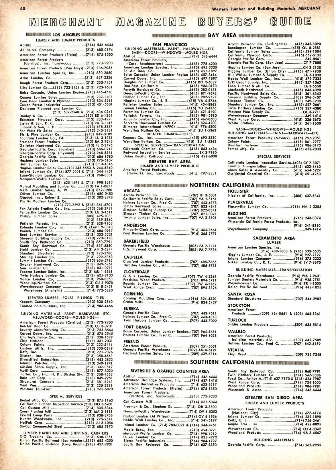 SPECIAI SERVI CES_TMNSPORTATION Gif broth Chcmlcql Co. ......,-.............(/tl 5l 863-1131 R.dw@d Inrpaction Scryicr -..-.-.---................EX 2.7880 Utrion Pocitic lollrood .--.........----.......(41 51 421 -6030 O$ATER 8AY ATEA I.UMBER AND I.UMEER PRODUCTS Amcricon For6f Produclr. fNework), inc. hordwoods ...-.."....{415) 797"235'l ,ift;"{'.i 6tri' Arcofa Rcdwood Co. (Burllnlonol .-....1a151 3r42.80e0 Bonnlnslon lumbor C,o. ..........-...14151 Ol, 8-2881 Colifornio lumbor Solcr ...................,..(/tl51 53a-l(XX Collfornlo Plywmd Corp, .....-.............(,ll 51 652.5153 Gco6lc-?ociflc Con. .........-......................---849-056t Gcorglo.Podflc Ccrp. lSon Jml ...........-.....CY 7.7800 Higginr Lumbcr Co. (Soa Jorl .....-...........-.CH 3.3120 Higglnr tumbcr Co, (Unlon Cltyl ......(4151 a7lnlt00 Hill Whb. [umbi & SupDly Co. -..,...,.......t4 5.1000 Hobbr Woll lunbu Go., Inc. -.-.......(4151 179-7222 K/D Ctdot Supply. Inc. .......-...............111 5l 357-1063 lop lunbcr & Jr{lll Co. LA 3-t550 ,rtocBoth Hordvood .-..-,.....-.............(41 5, 843-.390 Poclflc Hordrcod Solrr Co. -.............(,ll5l 261.6312 Simpton Buildins Supply co. -.---.---..-(/108) 2<16-0197 Simpron Tinbcr Co. .........--....--...--.(,1081 219.3900 Stqndord lumb.r Co., Inc. .........--.....14151 52r-3661 Twin f{qrbon lumbrr Qc, ..................(4151 327-1300 W.tlr.n Pitr. Supply Cl. Ot 3-7711 Wrycrhocurr Compony ....3,a9.1a11 W6l Rone. Corp. --...-............-.......1at51 326.3ttt0 Whltc Brofhar ......(4151 261-1600 SASH-DOORS-W| NDOWS*I OUt Dt NGS BUI I.DING MATEIIAIS-PAINT-+IATDWATE_ETC. Amricqn Foret Producft (Ncvorkf ..l1l5l 797-t351 Cof ony Polntr --..-..--.-...-......,...--.....-.---.-.(,al 51 861 -2977 Duo-fqrt Fqrlocr -.(/tl 5) 986-0173 Pcmko Mfe. Co. .....-...........-......-....-...(41 5l 653-2033 SPECtAL SEtVtCES Cofifornio Lumbu Inrpcctlon Srryico..l408l CY 7-8071 Co..llo Tretrrporloflon ..----.............-----(,lt 5l 632.,L60 Mco Solc & Arnmbly Co. ...-..-,..(,tl5l 651-5921 Oc.idontqf Chsnicol Co. ..-............---...1/al51 151 -1250