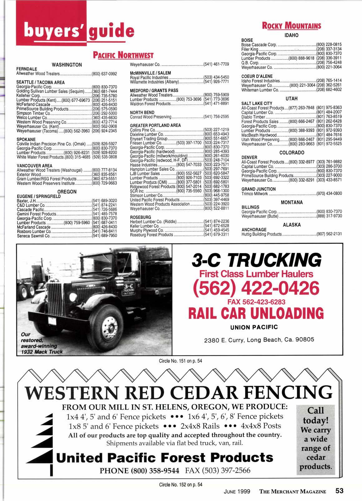 Ckcle No. t51 on p. 54 WESTERN RED CEDAR FENCING -1 -/ ^/ ^a ^a I FROM OUR MILL IN ST. HELENS, OREGON, WE PRODUCE: 1x4 4',5' and 6' Fence pickets o o o l1f 4',5',6', 8' Fence pickets 1x8 5' and 6' Fence pickets o o o /v{v$ Rails o o o {a{1$ Posts All of our products are top quality and accepted throughout the country. Shipments available via flat bed truck, van, rail. United Pacific Forest Products PHONE (800) 3s8-es44 FAX (s03) 397-2566 Chcle No. 152 on p. 54 JuHe 1999 Tnr Mrnctrnnr Maclzrxn 53