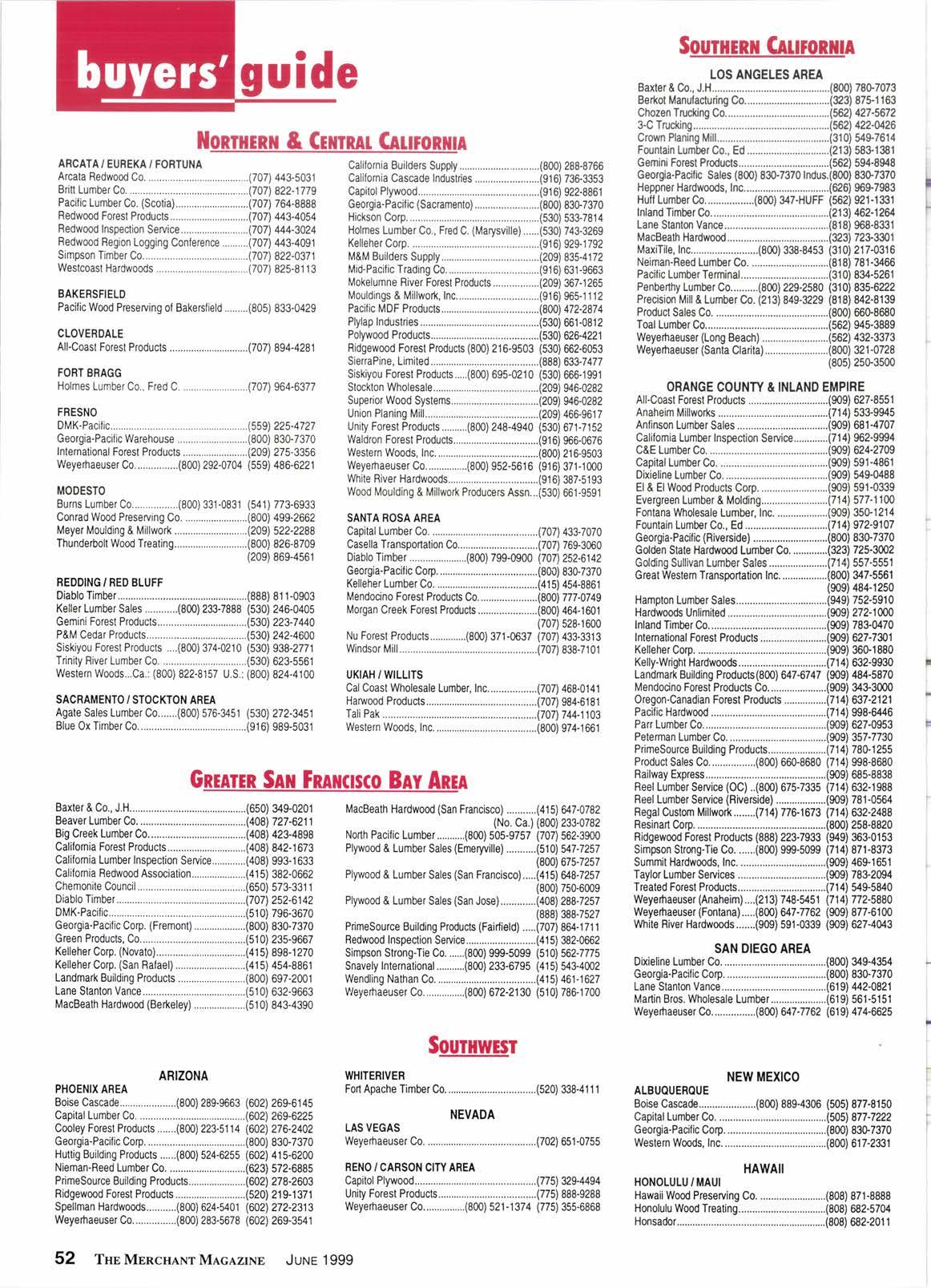 Merchant Magazino, Inc. Periodicals Postage paid at Newport Beach, Ca., and addtional post oflicss. ll is an ind€pendenily-owned publication for the retail, wholesale and distribution levels of the lumber and h,ilding products markets In 13 westem states. Copydghtl01999 by The Merchant Magazine, Inc, Cover and entire contents are lully protected and musl not be reproduced in any manner without writlen permission. All Righls Reserved. lt r€seNes the rigillt to accepl or rejecl any editodal or advertising maller, and assumes no liability for materials lumished to it. 5 t8 20 34 36 42 48 48 49 50 52 54 54 Idirodol llews Briefs Calendar Quote of the tlonlh Personols llew Produ:ts lelfet: 0bituaries llew lilerulure Clcssifi ed ldYerfisements Buyer'Guide Ad Index IAX Response lonn OF THIS WORLD VAIUES FOR Doug tir KfD 1x2-{r12 & larget Redweod KfD S4S & patterns Redwood upper$ & commons Cedar KID STK Ro. ${$ & patterns Cedar KfD e&Btr. Ro. $4$ & patterns PRODUCT SRTCS CO 2202N. Pacific (P.0. Box 4989), Orange, CA 92863-4989 (714) 998-8680. (800) 660-8680. FAX 714-921-8249 Circle No. lM on p.54 4 TnB MsncHlxr Mlclzrxs Jurue '1999
