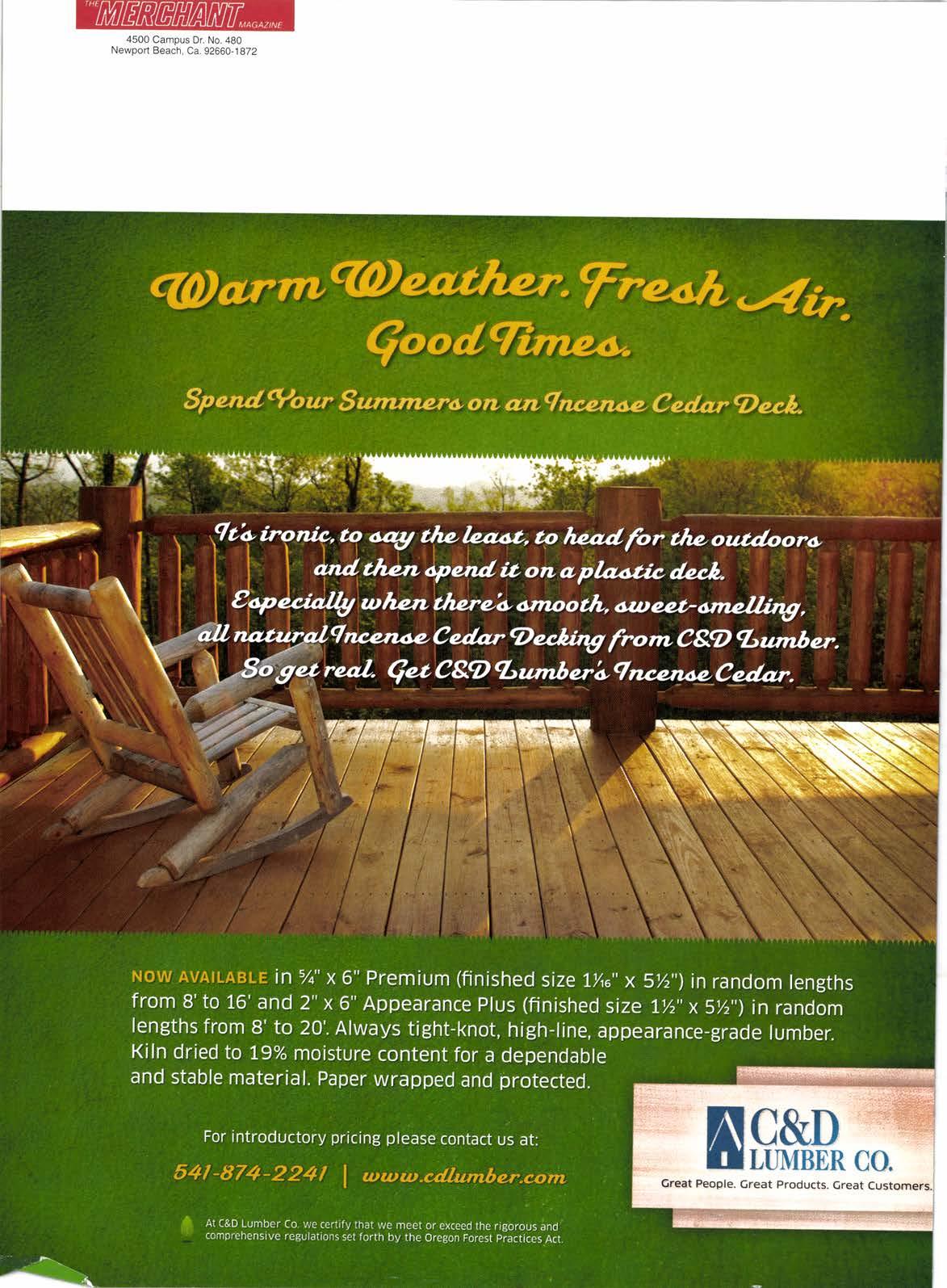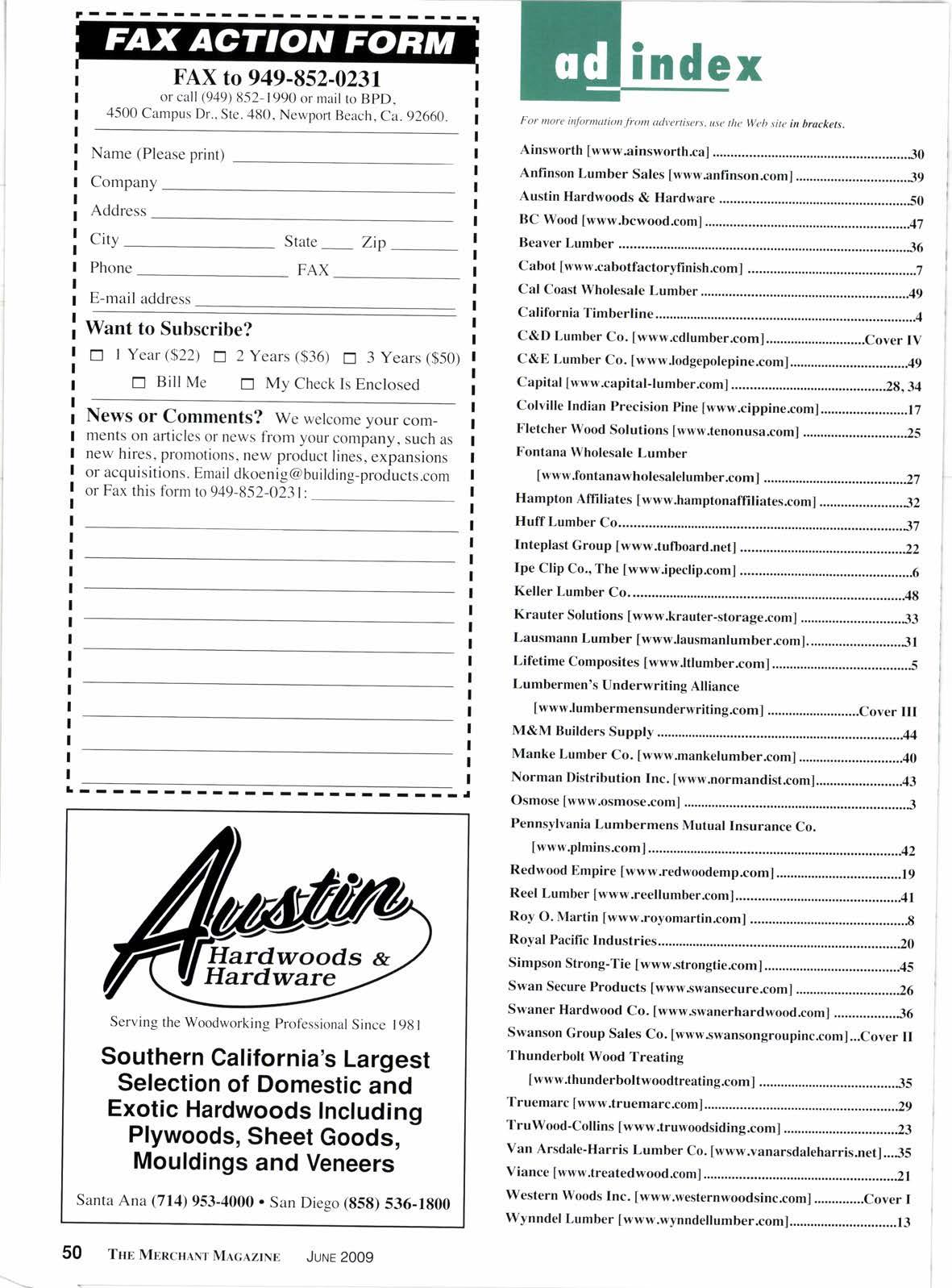 index FAx to 949-852-0231 or call (949) 852-1990 or mail to BpD. 4500 Campus Dr., Ste.480, Newport Beach, Ca. 92660. For more information from otlvertisers, use the Web site in brackets Name (Please print) Company Address Phone State FAX E-mail address Want to Subscribe? tr I Year ($22) n 2 Years ($36) tr 3 Years (g50) [] BillMe tr Mv Check Is Enclosed Ainsworth [www-ainsworth.ca] .............. ...............30 Anfinson Lumber Sales [www.anfinson.com] ...,..........,..............,.J9 Austin Hardwoods & Hardware ...,........................50 BC Wood [www.bcwood.com]............... .................47 Beaver Lumber ...............,..... .,........36 Cabot [wwwcabotfactoryfinish.com] .....,..... ........,..7 Cal Coast Wholesale Lumber.......... .........,..,...........49 California Timberline.... ...........,.......4 C&D Lumber Co. [www.cdlumtrer.com]...,..........,.........,...Cover IV C&E Lumber Co. [wwwJodgepolepine.coml.....,.,............... ..........4g Capital [www.capital-lumbercom].. ...........,.....2E,34 Colville Indian Precision Pine [www.cippinecom],.......................17 Fletcher Wood Solutions [www.tenonusa.com] .............................25 Fontana Wholesale Lumber Iwww.fontanawholesalelumber.com] ....,....... ...,........................27 Hampton Affiliates Iwww.hamptonaffiliates.com] .......................32 HuffLumber Co.....,............. ,..........i7 Intepfast Group [www.tufboard,net] .....................22 Ipe Clip Co., The [www.ipeclip.com] ................................................6 Keller Lumber Co.....,............. .........4g Krauter Solutions [www.krauter-storagecom]