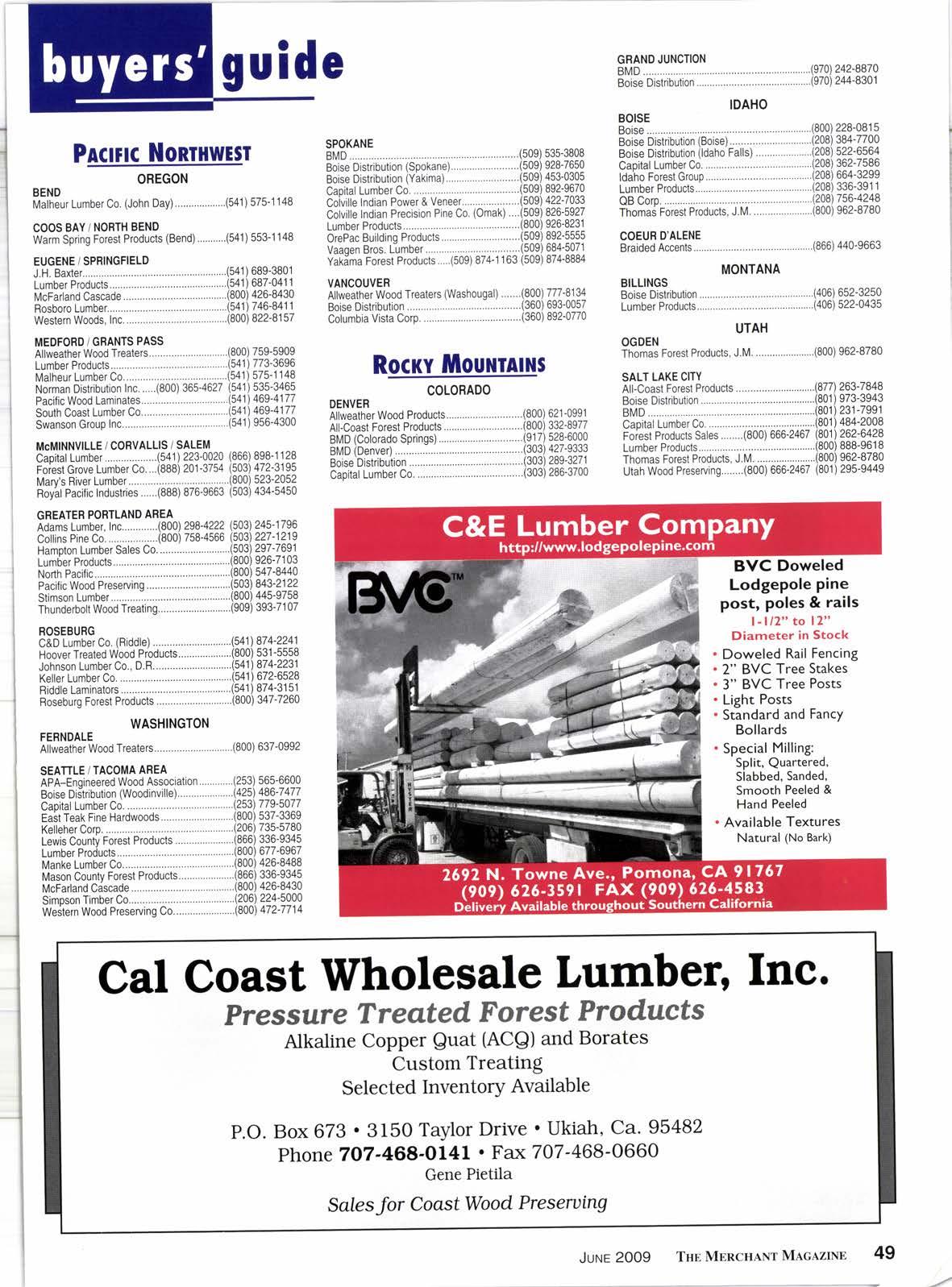 BEND MalheurLumberCo. (John Day).... ..(541)575-1148 COOS BAY / NOBTH BEND Warm Spring Forest Products (Bend) .(541 ) 553-1 148 EUGENE / SPRINGFIELD J.H.8axter..,........,.. ....(541)689-3801 Lumber Products.... ..(541) 687-041 1 McFarland Cascade . . .(800) 426-8430 Rosboro Lumber..... . . ..(541) 746-841 1 Western Woods, Inc................... .....(800) 822-8157 MEDFORD / GFANTS PASS Allweather Wood Trea1ers........... .(800) 759-5909 Lumber Products.... ....,..(541) 773-3696 Malheur Lumber Co (541) 575-1 148 Norman Distribution Inc......(800) 365-4627 (541) 535-3465 Pacilic Wood Laminates.....,,............. (541) 469'4177 South Coast Lumber C0..................... .....\541) 469-4177 Swanson Group Inc .(541) 956-4300 McMINNVILLE / CORVALLIS / SALEM Caoital Lumber...,...............(541) 223-0020 (866) 898-1 128 Foiest Grove Lumber C0..,,(888) 201 -3754 (503) 472-31 95 Marv's River 1umber............. (800) 523-2052 Rovhl Pacific Industries ......(888) 876-9663 (503) 434-5450 GREATER PORTLAND AREA Adams Lumber, |nc.,........... (800) 298-4222 (503\ 245 1796 collins Pine co...................(800) 758-4566 (503) 227-1219 Hampton Lumber Sales Co.............. ..,. (!qq) ?91 1991 Lumber Products..... .....(800) 926-7103 North Paci1ic........... (800) 547-8440 Pacilic Wood Preserving....,,.......... (qgq) q{-?1?? Stimson1umber..........-........ .......(800)445-9758 Thunderbolt Wood Treatin9................. (909) 393-71 07 BOSEBURG C&D Lumber Co. (Biddle) .(541\ 874-2241 Hoover Treated Wood Prbducts... ...(800) 531 -5558 Johnson Lumber Co., D.R............. ..'.'(541) 87 4'2231 Keller Lumber Co, .(541) 672-6528 Riddle Laminators,. (541) 874-3151 Roseburg Forest Pr0ducts ...(800) 347-7260 WASHINGTON FEBNDALE Allweather Wood Treaters.................. .(800) 637-0992 SEATTLE / TACOMA AREA APA-Enoineered Wood Association (253) 565"6600 Boise Di;tribution (woodinville)......... ...(!?rl !9q1!7-l CaDital Lumber Co.. .(253) 779-5077 Ealt Teak Fine Hardwoods...........,.......... (800) 537-3369 Kelleher C0r0...,..,.. .(206) 735-5780 Lewis Countv Forest Products..... ...(866) 336-9345 Lumber Prorjuds.... (800) 677-6967 Manke Lumber C0... .(800) 426-8488 Mason County Forest Pr0ducts.....,...... (qqq) qqq-9q1! McFarland Cdscade .....(800) 426-8430 Simpson Timber Co ......(206) 224-5000 Wedtern Wood Preserving Co......... .....'..... ..(800). 472-7714 VANCOUVER Allweather Wood Treaters (Washougal) Boise Distribulion Columbia Vista Corp SPOKANE BMD....................... .....(509) 535-3808 Boise Distribution (Spokane)................ . ..(qq9) q?q-Zqqq BoiseDistribution(Yakima)-................ (qq9)lqq'qqqq Caoital Lumber Co. ..(509) 892-9670 Coiville lndian Power & Veneer.............. (509) 422'7033 Colville Indian Precision Pine Co. (Omak). (509) 826-5927 Lumber Products.... ...(800) 926-8231 orePac Building Products........... .. (qqg) 99?!!99 Vaaoen Bros. L-umber.....,.,............. ..........(509) 684-5071 Yakima Forest Products.....(509) 874-1 163 (509) 874-8884 OREGON GRAND JUNCTION BMD ...............,....... .......(970) 242-8870 Boise Distribution... (970) 244-8301 IDAHO BOISE Boise.......,.........,.... (800) 228-0815 Boise Distribution (Boise)................ .(208) 384-7700 Boise Distribution (ldaho Falls) .(?gq) !??{1q1 Caoital Lumber Co. . ...(208) 362-7586 ldaho Forest Group. (208) 664-9?99 Lumber Products.... .(208) 336-391 1 OBCoro.,............,.. .....(208)756-4248 Thomad Forest Products, J.M. .....,.............. .(800) 962-8780 COEUR D'ALENE Braided Accents.,.,. ,.,....(866) 440-9663 MONTANA BILLINGS Boise Distribution... ... (406) 652-3250 Lumber Products..,. (406) 522-0435 UTAH OGDEN Thomas Forest Products, J.M. . .. ..(800) 962-8780 SALT LAKE CITY All-Coast Forest Products .,.. ..(877) 263-7848 Boise Dislribution... ..,.. (801) 973-3943 BMD .......,.........,..,.. .......(801 ) 231 -7991 Caoital Lumber Co, ..(801) 484-2008 Foiest Products Sales ........(800) 666'2467 (801) 262-6428 Lumber Products............... ..(800) 888-9618 Thomas Forest Products, J.M.........,.......... .(800) 962-8780 Utah Wood PreseNing........(800) 666-2467 (801) 295'9449 BVC Doweled Lodgepole pine post, poles & rails l-l12" to 12" Diameter in Stock ' Doweled Rail Fencing .2" BVC Tree Stakes 3" BVC Tree Posts Light Posts Standard and Fancy Bollards Special Milling: Split, Quartered, Slabbed, Sanded, Smooth Peeled & Hand Peeled Available Textures Natural (No Bark) .....(800) 777-8134 .....(360) 693-0057 .....(360) 892-0770 COLORADO DENVER Allweather wood Products.....,.,....................(800) 621-0991 All-Coast Forest Pr0ducts......... ....(800) 332-8977 BMD {Colorado Sprinqs) ...,.,......... (91 7) 528'6000 BMD iDenver) ..........-................,............... ..(303) 427-9333 Boise'Distribuiion... ......(303) 289-3271 CaDital Lumber Co. .(303) 286'3700 49