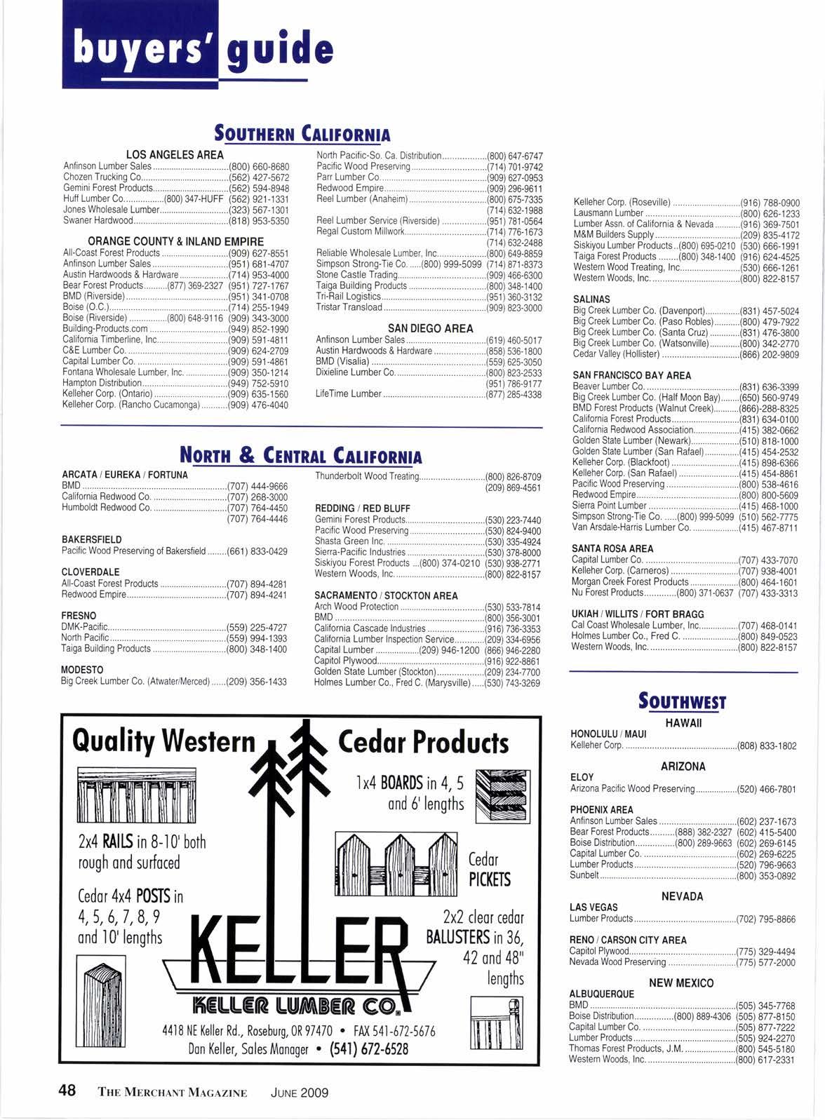 S24-9400 Shasta Green Inc. ..................,......................(530) 335-4924 Sierra-Pacific Industries ..,.........................,...(530) 378-8000 Siskiyou Forest Products ...(800) 374-0210 (530) 938-2771 Western Woods, Inc....,....,............................(800) 822-8157 SACRAMENTO / STOCKTON AREA Arch Wood Proteclion.......,.,.......................,.(530) 533.7814 BMD .......(800) 356-3001 California Cascade Industries.......................(916) 736-3353 California Lumber Inspection Service............(209) 334-6956 Capital lumber...,.......,..,....(209) 946-1200 (866) 946-2280 Capitol Plywood....., .......(916) 922-8861 Golden State Lumber (Stockton)...................(209) 234-7700 Holmes Lumber Co., Fred C. (Marysville).....(530) 743-3269 Lausmann Lumber.. ......(800) 626-1233 Lumber Assn. of California & Nevada...........(916) 369-7501 lvl&M Builders Supp1y..............................,....,(209) 835-41 72 Siskiyou Lumber Products.,(800) 695-0210 (530) 666-1991 Taiga Forest Products ........(800) 348-1 400 (91 6) 624-4525 Western Wood Treating, Inc.....,...............,..,.(530) 666-1261 Western Woods, Inc.................................,....(800) 822-8157 SALINAS Big Creek Lumber Co. (Davenport)...,.,.........(831 ) 457-5024 Big Creek Lumber Co. (Paso Robles)..... ......(800) 479-7922 Big Creek Lumber Co. (Santa Cruz) ....,......,.(831 ) 476-3800 Big Creek Lumber Co. (Watsonville)....,., ......(800) 342-2770 Cedar Valley (Hollister) ....................,.,.....,....(866) 202-9809 SAN FRANCISCO BAY AREA Beaver Lumber Co.. ......(831) 636-3399 Big Creek Lumber Co. (Half Moon Bay)........(650) 560-9749 BMD Forest Products (Walnut Creek),..........(866)-288-8325 Calilornia Forest Products................,.,.,.....,..(831 ) 634-0100 California Redwood Association.......,.........,..{41 5) 382-0662 Golden State Lumber (Newark)........,..,.,.,.....(510) 818-1000 Golden State Lumber (San Rafael).....,.,. ......(415) 454-2532 Kelleher Corp. (BlacHoot)...................,.......,.(415) 898-6366 Kelleher Corp. (San Rafael)............,.............(415) 454-8861 Pacific Wood Preservin9...............................(800) 538.4616 Redwood Empire..... ......(800) 800-5609 Sierra Point Lumber ......(415) 468-1000 Simpson Strong-Tie Co. .....(800) 999-5099 (510) 562-7775