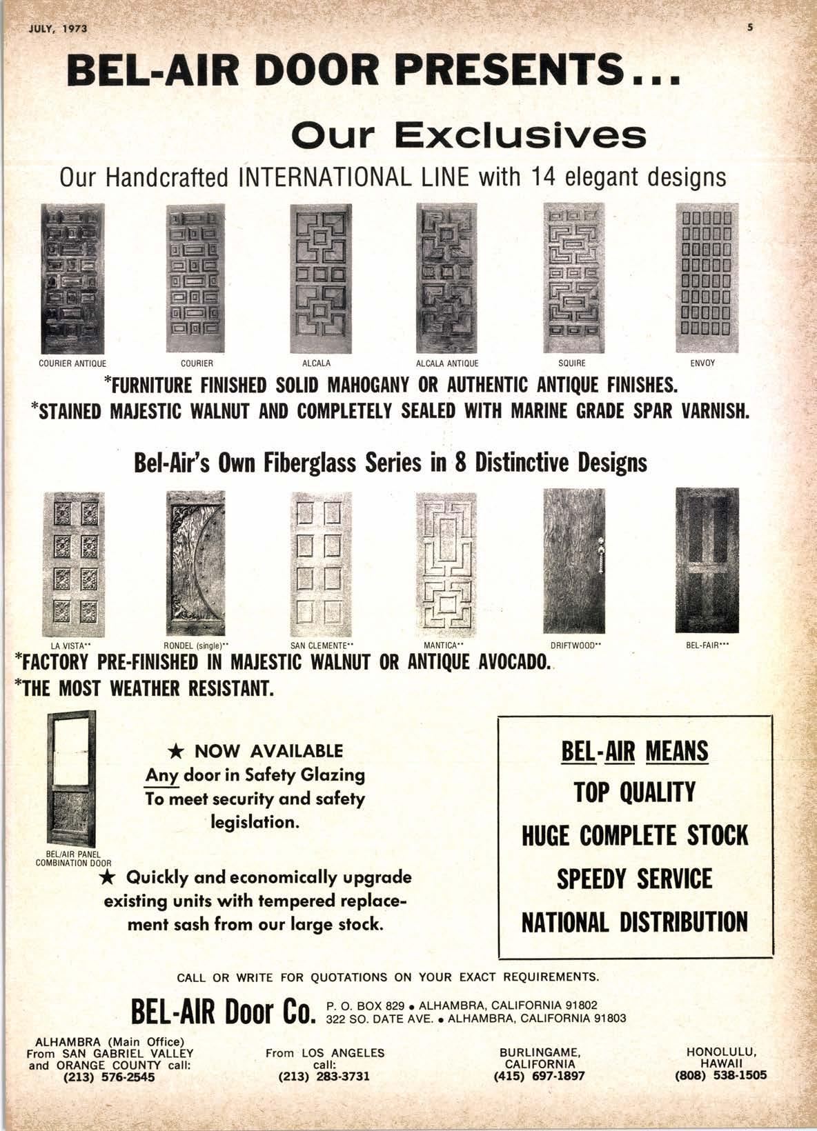 BEL.AIR DOOR PRESENTS I r I Our Handcrafted INTERNATI0NAL LINE with 14 elegant designs ffi COURIER ffiffil: lagr fq LA VISTA.' RoNDEI (single)" SAN CLEMENTE- -TACTORY PRE-FII{ISHED I]I TIIAIESTIC WATIIUT *THE II(IST WEATHER RESISTAIIT. * NOW AVAIIABIE Any door in Sofefy Glozing To meel security ond sofety legislofion. BEUAIR PANEL coMBrNAT|oli 000R * Quickly ond economicolly upgrode existing unils with tempered replocemenl scrsh from our lorge stock. Our Exclusives ffi ALCALA COURIERANTIOUE ALCALA ANTIOUT .FURilITURE Ft!ilSHElt S0ull MAH0GAilY 0R AUTHEIITIC AI{TIQUE FllllSHES. *STAI]IEII MAIESTIC WAI.IIUT A]{D COMPTETETY SEATED WITH MARII{E GRADE SPAR UAR}IISH. ry DRIFIWOOD* q BEL.FAIR*' 0R AIIT|QUE AU0CADo. CALL OR WRITE FOR QUOTATIONS ON YOUR EXACT REQUIREMENTS. BURLINGAME, CALIFORNIA (4r5) 697.1897 Bel-Air's (|wn Fiberglass Series in 8 Distinctive Designs ffiW From LOS ANGELES call: (213) 28:r-373r BEL.AIR MEAilS T(|P QUATITV HUGE C(|]IIPIETE ST(ICI( SPEEIIY SERUICE l{ATt0ltAt DlSTRlBUTl0ll B E [ -A I R D o o r C 0. L,.#:J^H ;#Ht?lfr sf^'] ["^lua ilff 1,,0. ALHAMBRA (Main Office) From SAN GABRIEL VALLEY and OMNGE COUNTY call: (2r:t) 576-?5415