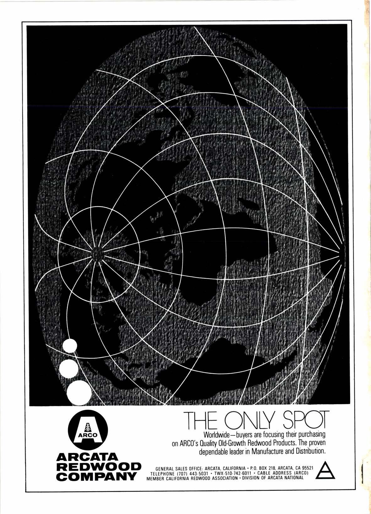 s { THE ONLY SPOT Worldwide - buyers are focusing their purchasing on ARC0's Ouality 0ld-Growth Redwood Products. The proven dependable leader in Manufacture and Distnbution. GENERAL SALES (tIFICE. ARCATA, CATIF(]RNIA PO. BOX 218, ARCATA, CA 9552I TEtEPH0NE t7071 443-5031 . TWX-510-742-6011 ' cABLE A00RESS (ARC0l MTMBER CALIFORNIA REOWOOD ASSOCIATION OIVISION OT ARCATA NATIONAL l