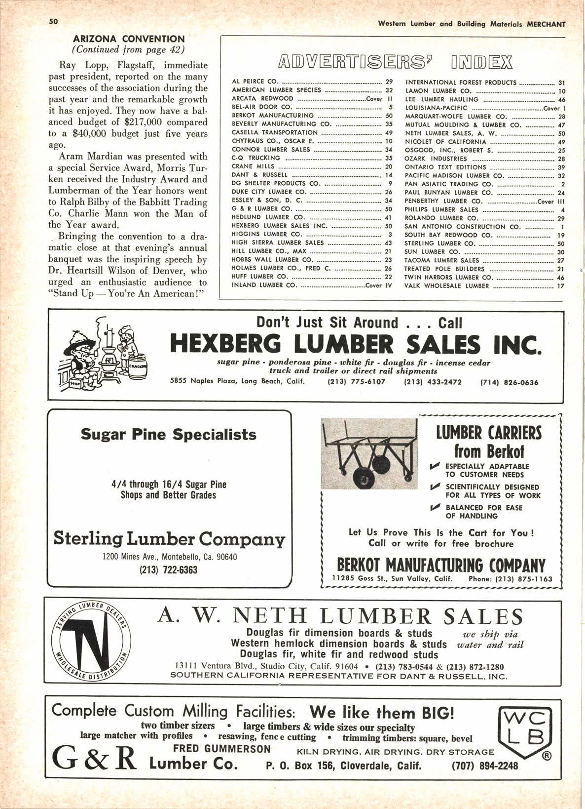 4/4 througn 16/4 Sugar Pine Shops and Better Grades Sterling Lumber Company 1200 Mines Ave., Montebello, Ca. 90640 (213) 722-6363 lel Us Provb This Cqll or wrife TUMBTR ORRITRS ftom Be*of ESPECIAITY ADAPTAELC TO CUSIOiAER NEEDS SCIENTIFICALIY DESIGNED FOR ALt TYPES OF WORK BAIANCED FOR EASE OF HANDLITTG ls the Cqrt for You ! for free brochurc 1/ 1/ t/ BTRI(()I MAilUTAOURIIIO OI{PAIIY I1285 Goss St., Sun Volley, Colif. Phone: {2131 875-1163 A. W. NETH LUMBER SALES .-- Douglas fir dimension boards & studs tae sbiqt aia Western hemlock dimension boards & studs utater and-rail Douglas fir, white fir and redwood studs l3lll Ventura Blvd., Studio City, Calif.91604 r (213) ZE3-0544 &(2tg\E7Z-L2EO SOUTHERN CALIFORNIA REPRESENTATIVE FOR DANT & RUSSELL. INC. complete custom Milling Facilities: we like rhem BIG! two timb.er sizers ' 1".g9 timbers & wide sizes our speciarty latge matcher with profiles resawingf fence cutting . timming'timberi: square, bevel FRED GUMMERSON KILN DRytNG. AtR DRytNG. DRy sroRAGE Ge<R LUmbgf CO. P. 0. Box 156, Gtoverdate, Gatif. (707) 894-2248