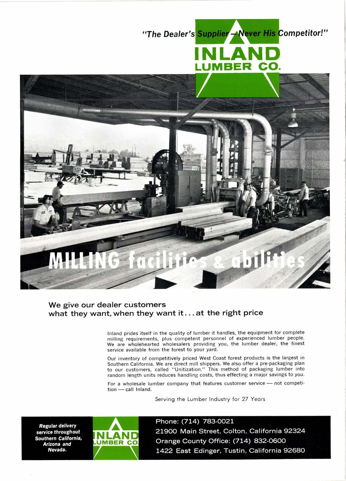 Our inventory of competitively priced West Coast forest products is the largest in Southern California. We are direct mill shippers. We also offer a pre-packaging plan to our customers, called "Unitization." This method of packaging lumber into random length units reduces handling costs, thus effecting a major savings to you. For a wholesale lumber company that features customer servicenot competitioncall Inland.