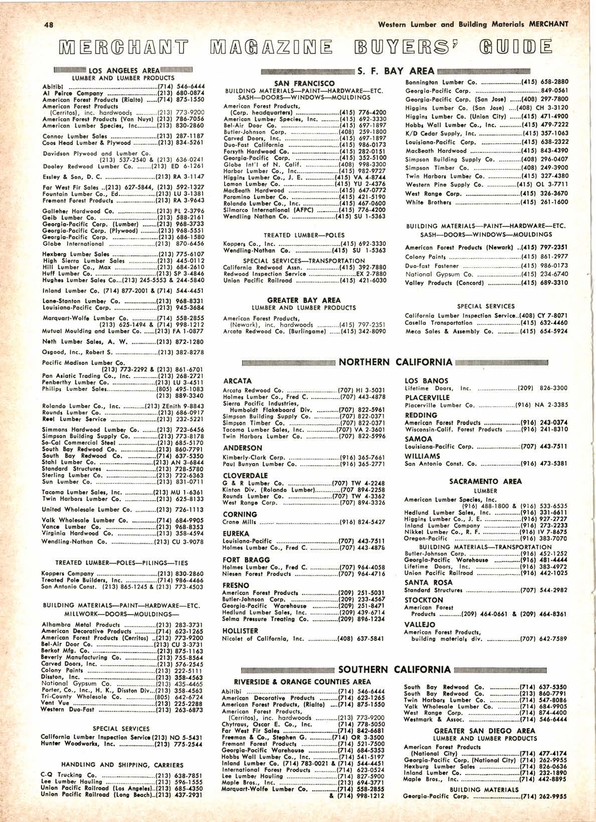 A21-5127 EUNEXA louirlono-Pociflc .--.17071 113-7511 Holm6 lunb.r Co,, Frcd C. .-------........(7071 113-1879 FORT BRAGG Holmo lumbrr Co., Frod C. ........-.......17071 964-a058 Nicrrn Fonrl Productr ...................-.-..17071 961-171 6 FRESNO Am.ri@n tont Productr ...-................(2091 251 -5031 Butfcr-rohnron Ccp. ..--..--.......---...-..--(2091 233-a567 Gqorslq-Pocific Worrhourr ............-.(2091 251-8171 Hcdfund Iumbcr Solct, Inc. --.............-(2091 139.6711 Sclmo Pnrurr Trcatint Co. ..............(209, 896-1231 HOttISTER Nicolel of Colifornio, Inc. .....-.---.---..(,1081 637-584t REDDING Amcriccn Forot Prduct3 -------.-..-(91 61 213-037 1 Wirconrin-Colif, Forctt Ptoduclr .---.---(916) 2,al-8310 SA'YIOA Lociriono.Poclfic Corp. .........---.........--:17071 113-r5ll wltltAt s 5qn Antonio Conrt. Co. .---...-.............(9.|6) 473-5381 SACNAMENIO ATEA IUMBER Amcricon Lumbrr Sprcler, Inc. (9r61 488-r800 & (9r61 533-6535 Hcdlund tumbcr Sslu, Inc. ........--..-.(9161 331.6611 Higsinr lunbcr Co., J. E. .........-....---...(9161 i27-2727 nlond Lunbcr Conpony .....------...-...(9161 273-2233 Nilt.f lumb.r Co., l. F. .....-..--...---.--.(9161 lV 7-8675 Orqeon-Pocifi( ------(9161 383.7070 8U TDI NG IilATERIAI.S_TTANSPC'RTAIION Eutfc,.Johnion Corp, ...--.....---...--.-.-----.-(9161 152-1252 Gorglo.Poclflc Wotchcurc ..............(9161 181-141 Iifctina Doo.r, Inc. .....--.-..---.-.------.(9161 383-/t972 Union Pocific Roilreod ..--.-------.......--..(9161 112-1O25 SANTA ROSA Stsndord Strcctur.! --.....---......--...-........17Or1511-2982 STOCKTON Anorlcon forctl frodu<rr ............(209) 46,4-0661 & (2091 454-8361 VAITEJO Amaricqn Fonl Produclr. buifding mat.riolr div. .-.--...--.......(7071 612-7589 ros BANos Iifelinc Doorr, lnc, PTACERVITIE Ploc..villc [unb.. Co. ............-.........(209) 826-3300 ........-...........(9r6) NA 2-3385 I