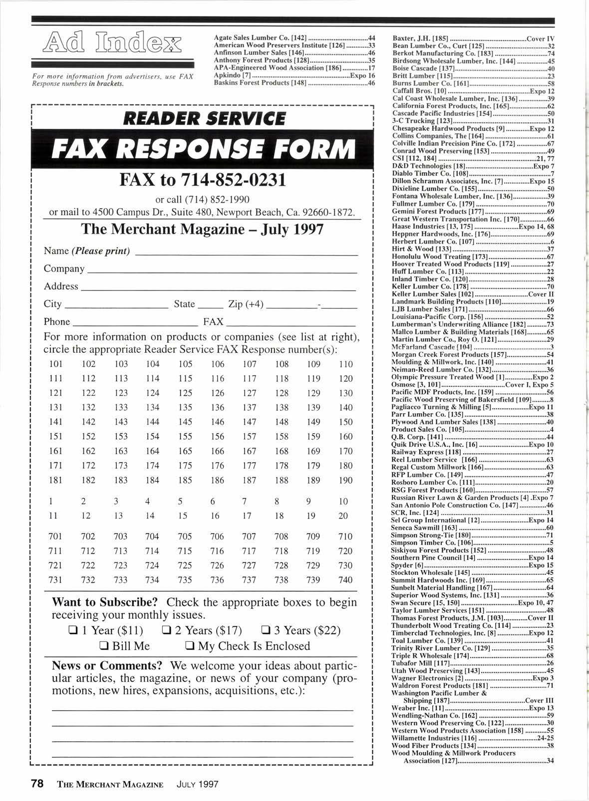 UE61..............17 Apkindo [{........ ................Expo 16 Baskins Forest Products [148] ...............,......,.........,46 Baxter, J.H. t1E51..,.........,..................,..........Cover IV Bean Lunber Co., Curt [25].,.,....---.-------.,...32 Berkot Manufacturing Co. [83] .....,.......,.......,.,.....7 4 Birdsong Wholesale Lumber, Inc. U44l ......,..,,,,....45 Boise Cascade [134.....,.......,..,...................,..,,.,...,.,..40 Britt Lumber [151....................................................23 Burns Lumber Co. [161]....,............................,......,..58 Calfall Bros. [10] ...............8xpo 12 Cal Coast Wholesale Lumber, Inc. [36]........,.......39 Califomia Forest Products, lnc. [165].....,..........,....62 Cascade Pacific Industries [54]................,,..,.,,,.,...50 3-C Trucking [1231............................................,,.,....31