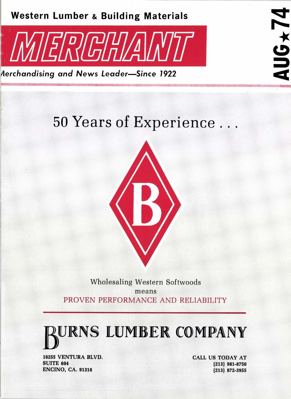 Western Lumber s Building Materials rchondising ond News leoder-Since 1922 =f F i C9 = 50 Years of E"perience . . . Wholesaling Western Softwoods means PROVEN PERFORMANCE AND RELIABILITY BIJRNS LUMBER, COMPANY CALI US TODAY AT (213) SS1-S760 (213) 872-3s58 1626' VENTURA BIVD. SUTTE SII{ ENCINO, CA.01310