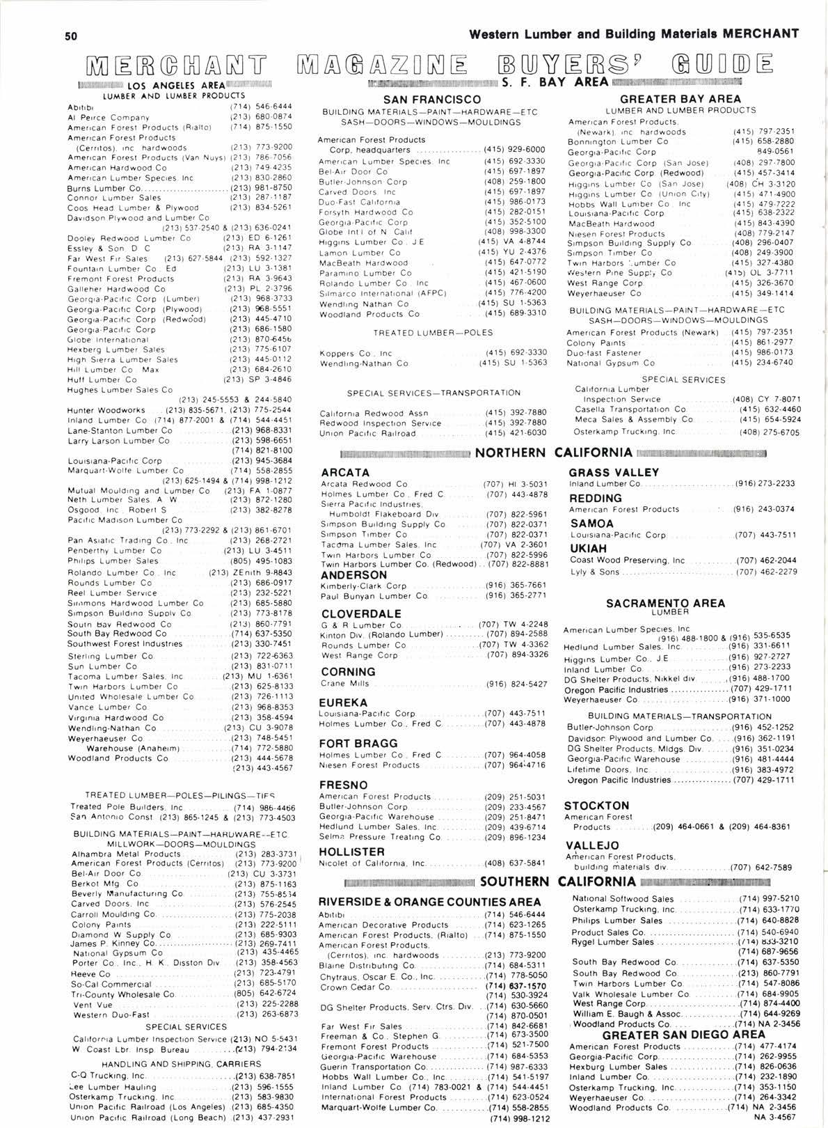 HUFF LUMBER CO. 28 HUNTER WOODWORKS 13 r.c.R. ooRPoRATTON 30 TNLAND LUMBER CO. COVER lV INTERNATIONAL FOREST PRODUCTS 31 JAMES P. KTNNEY CO. ...........48 LANE-STANTON LUMBEF CO. .........................3 LUNDGREN DEALERS SUPPLY 43 MARouART-woLFE LUMBER co. ?l MUTUAL MOULDING CO. 40 NrcoLET OF CAL|FORN|A............................. 43 PAN AS|AT|C TRADING CO. 51 PAUL BUNYAN LUMBER CO. .... ....................42 PENBERTHY LUMAER CO. ....................... 21 PH|L|PS LUMBER SALES 40 PROOUCT SALES CO. .............4 ROLANOO LUMBER CO. .........3l ROUNOS LUMBER CO. 53 souTH BAY REDWOOD CO...................... 48 STERLING LUMBER CO. .........26 suN LUMBER CO. 2s uNtoN PACIFIC ..... 17 VENT VUE PRODUCTS CO. 27 wEsr RANGE CORP. 41