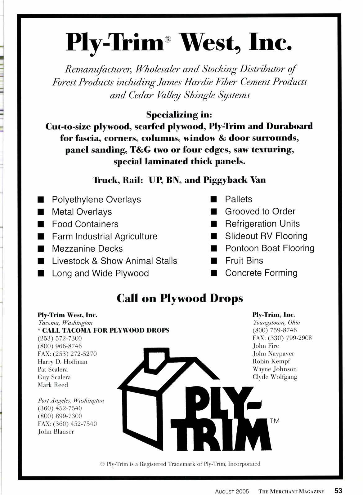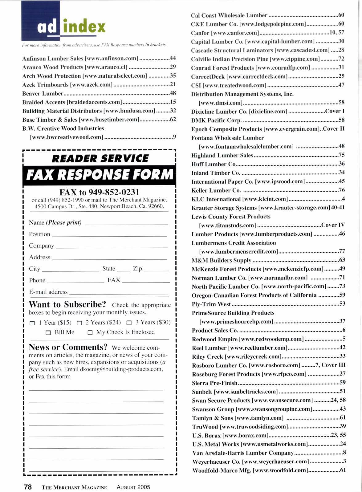 index For more information lrom advertisers, use FAX Response numbers in brackets. Anfinson Lumber Sales [www.anfinson.com] ....................44 Arauco Wood Products [www.arauco.cl] ...........................29 Arch Wood Protection [www.naturalselect.com] ..............35 Azek Trimboards [www.azek.com]........ .......21 Beaver Lumber........ Braided Accents [braidedaccents.com] Buifding Material Distributors [www.bmdusa.com] .........32 Buse Timber & Sales [www.busetimber.com]....................62 B.W. Creative Wood Industries [www.bwcreativewood.com] Cal Coast Wholesale Lumber....... .................60 C&E Lumber Co. [www.lodgepolepine.com].....................60 Canfor [www.canfor.com]............ ............10' 57 Capital Lumber Co. [www.capital-lumber.com] ...............30 Cascade Structural Laminators [www.cascadesl.com] .....2E Colville Indian Precision Pine [www.cippine.com]............7 2 Conrad Forest Products [www.conradfp.com] ..................31 CorrectDeck [www.correctdeck.com]... ........2s CSI [www.treatedwood.com] ........47 Distribution Management Systems, Inc. 15 Dixieline Lumber Co. [dixieline.com] ........................Cover I DMK Pacific Corp. ...........................58 Epoch Composite Products [www.evergrain.com]..Cover II Fontana Wholesale Lumber Iwww.fontanawholesalelumber.com] ............................48 Highland Lumber Sa1es............. .....................75 HuffLumber Co. ........................36 Inland Timber Co.... ....................34 International Paper Co. [www.ipwood.com]......................45 Keller Lumber Co. .......... .........76 KLC International [www.klcint.com]... ..........4 Krauter Storage Systems [www.krauter-storage.com] 40-41 Lewis County Forest Products [www.titanstuds.com] ....................Cover IV Lumber Products [www.lumberproducts.com] .................46 Lumbermens Credit Association Iwww.1umbermenscredit.com]........................................77 M&M Builders Supply ...........63 McKenzie Forest Products [www.mckenziefp.com]..........49 Norman Lumber Co. [www.normanlbr.com] ...................71 North Pacific Lumber Co. [www.north-pacific.com] ........73 Oregon-Canadian