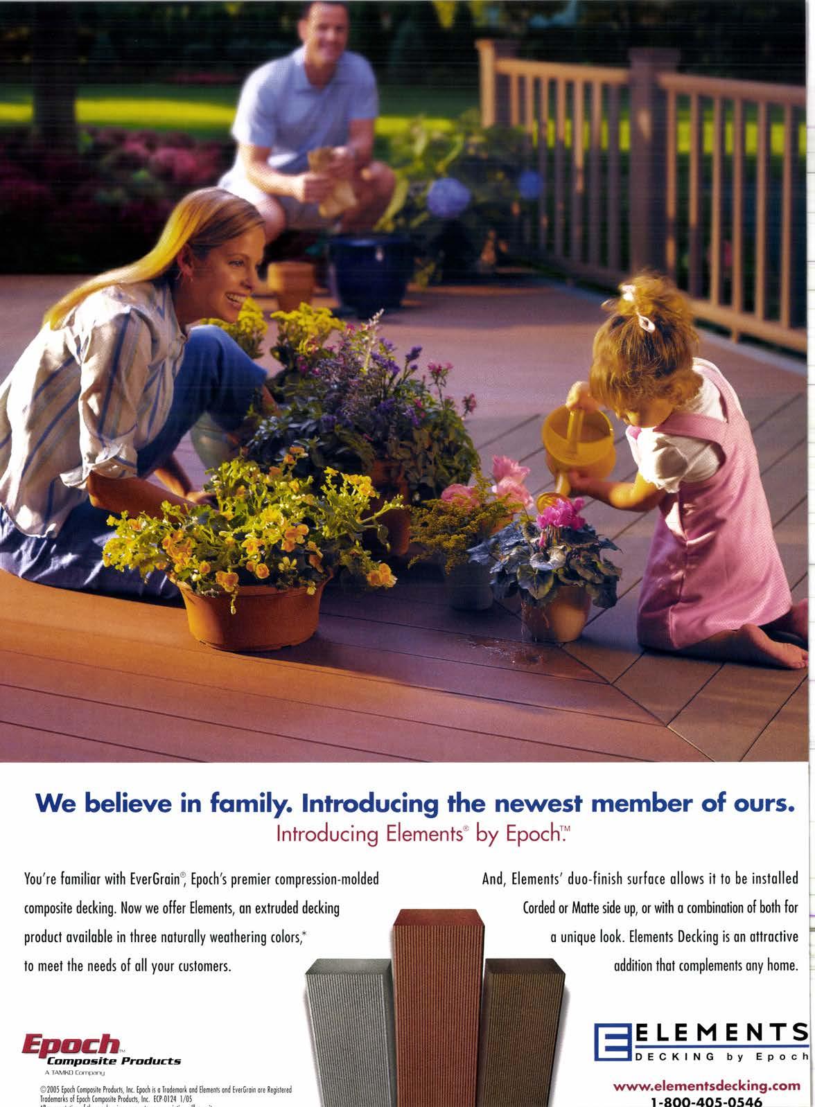 You're fomilior wilh EverGroini Epoch! premier compresion-molded composile derking. Now we offer Elemenls, on exruded decking producl ovoiloble in lhree noturolly weofhering colorsl lo meef lhe needs of oll your cuslomers.