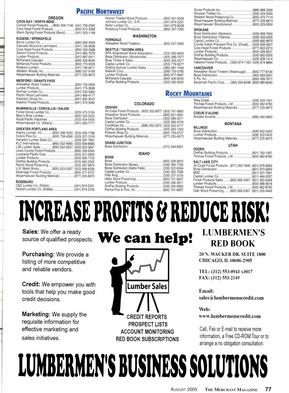 PROSPECT LISTS ACCOUNT MONITORING RED BOOK SUBSCRIPTIONS TUMBERMEN'S RED BOOK 20 N. WACKER DR. SUITE 18OO cmcAco,IL 60606-2905 TEL: (312) 553-0943 x3017 FAX: (312) 553-2149 Email: sales@lumbermenscredit.com Web: www.lumbermenscredit.com Call, Fax or E-mail to receive more information, a Free CD-ROM Tour or to arrange a no obligation consultation. Aucusr 2005 TnB Mencslxr MlclzrNB 77